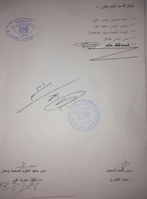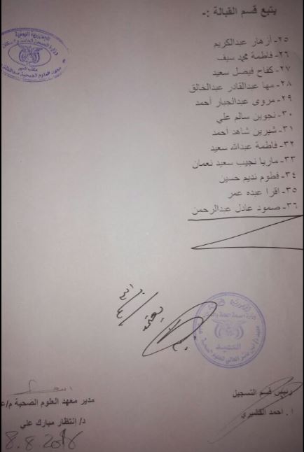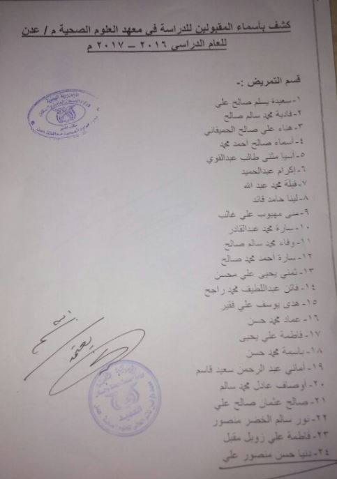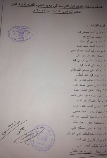 تم إقرار أسماء المقبولين للدراسة في معهد العلوم الصحية م/ عدن الكائن في المعلا للعام الدراسي 2017/2016 م و كانت وفقاً للتخصصات في الكشوفات التالية