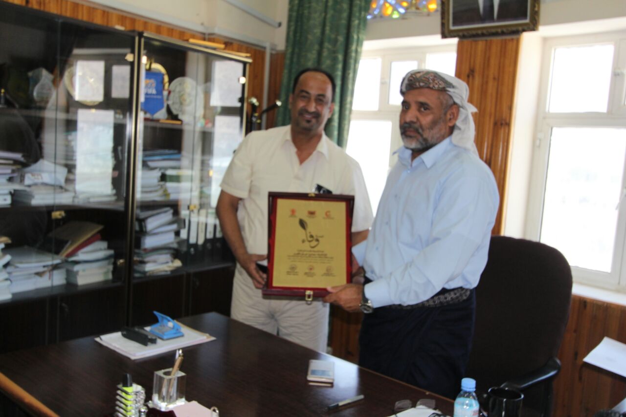 قدم الاخ مدير معهد للعلوم الصحية – سيئون د. محمد عوض لرضي درع الوفاء للاخ وكيل محافظ م/ حضرموت لشئون مديريات الوادي الاستاذ عصام حبريش الكثيري على الجهود الطيبه في دعم و مساندة أدارة المعهد و تذليل الكثير من الصعوبات و في كلمة الاخ مدير المعهد التي القاها تقدم للاخ الوكيل بفائق الشكر و الامتنان و نقل له تحيات عميد معهد د. أمين ناشر العالي للعلوم الصحية د. نجيب ناصر الحميقاني