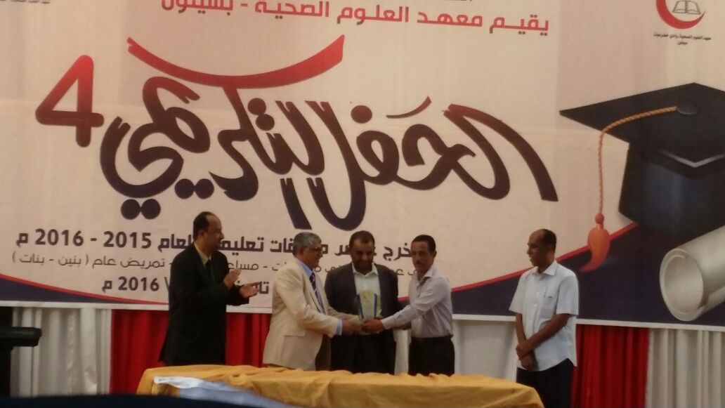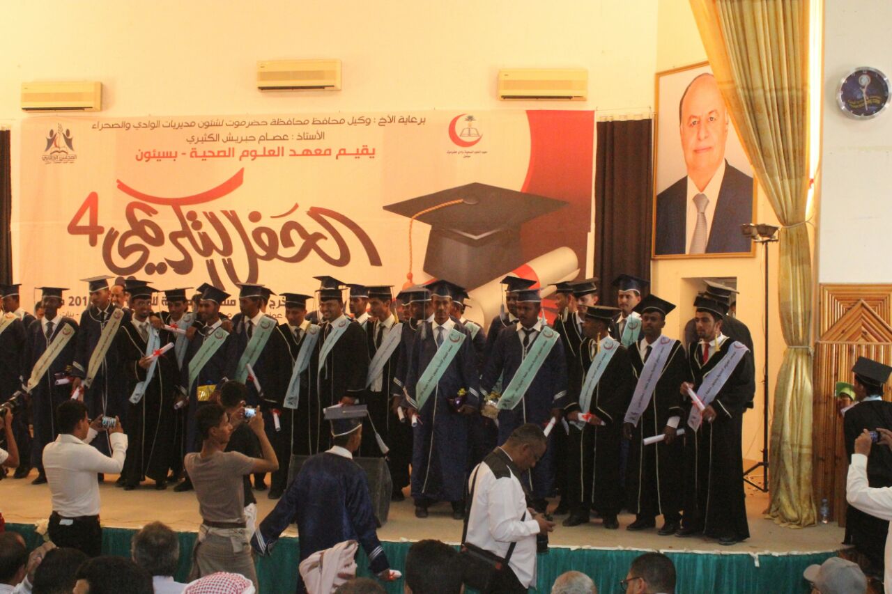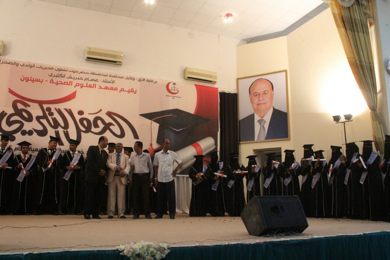 تحت رعاية الإستاذ : عصام حبريش الكثيري وكيل محافظة حضرموت لشؤون مديريات الوادي والصحراء ، أقام معهد العلوم الصحية / سيئون يوم الإثنين 2016/12/19م حفل تخريج 101 خريج و خريجة و شملت خمسة مساقات (( فني مختبر ، فني عمليات ، مساعد طبيب ، تمريض عام )).
