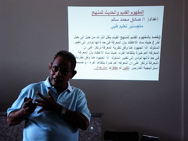 حيث قدم الاستاذ صادق محمد سالم مستشار عميد معهد د. أمين ناشر العالي للعلوم الصحية محاضرة حول “المفهوم القديم و الحديث للمنهج” حيث تطرق لشرح المفهومين و الفوارق بينهما و شرح مفهوم (KSA)
