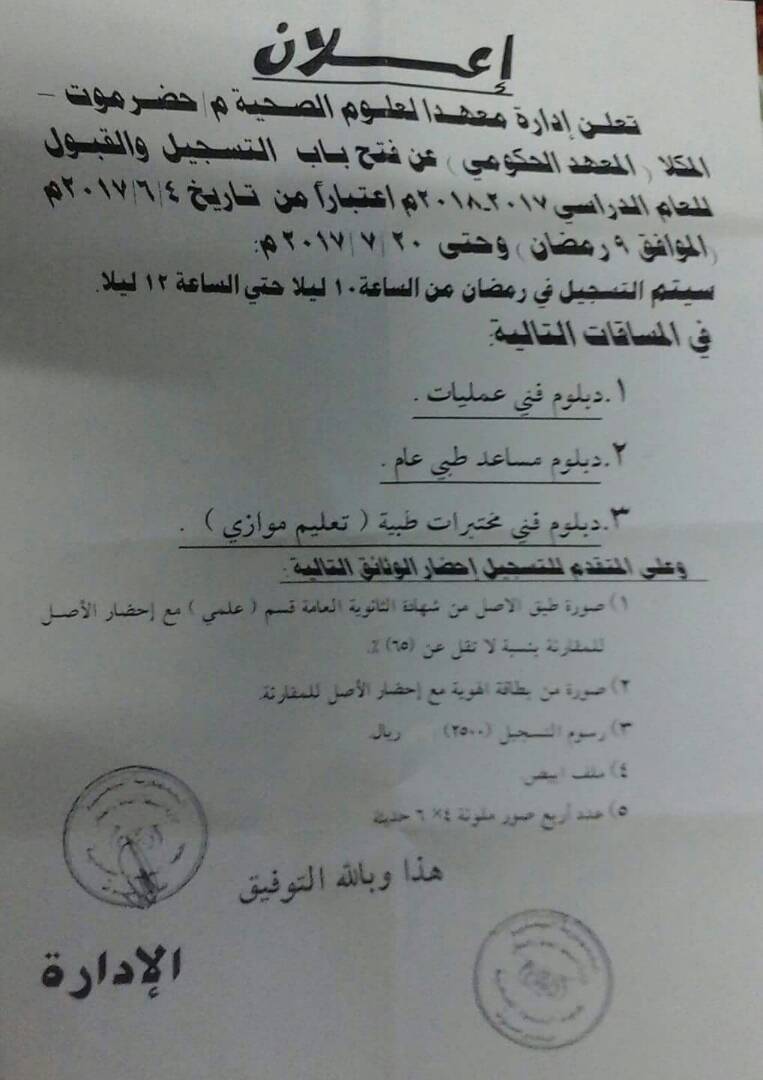 تعلن ادارة معهد العلوم الصحية م/ حضرموت – المكلا (المعهد الحكومي) عن فتح باب التسجيل و القبول للعام الدراسي ٢٠١٧ – ٢٠١٨ م اعتبارا من تاريخ ٢٠١٧/٦/٤ م (الموافق ٩ رمضان) و حتى تاريخ ٢٠١٧/٦/٢٠ م