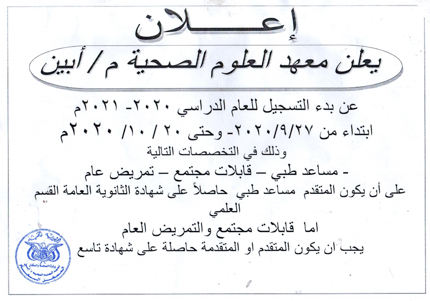 الاعلان عن موعد بدء التسجيل في معهد العلوم الصحية / أبين
