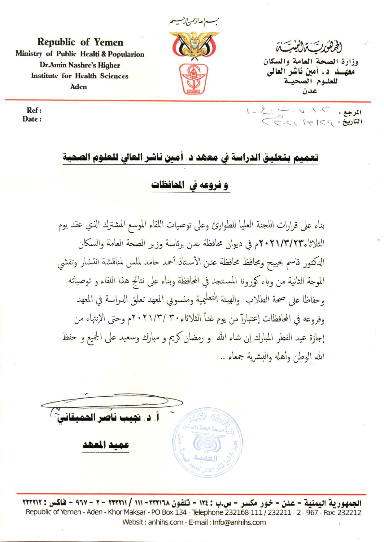 تعميم بتعليق الدراسة في معهد د. أمين ناشر العالي للعلوم الصحية و فروعه بالمحافظات بسبب الموجة الثانية لوباء كوروناتعميم بتعليق الدراسة في معهد د. أمين ناشر العالي للعلوم الصحية و فروعه بالمحافظات بسبب الموجة الثانية من وباء كورونا 2021-03-29zuhaer ahmad