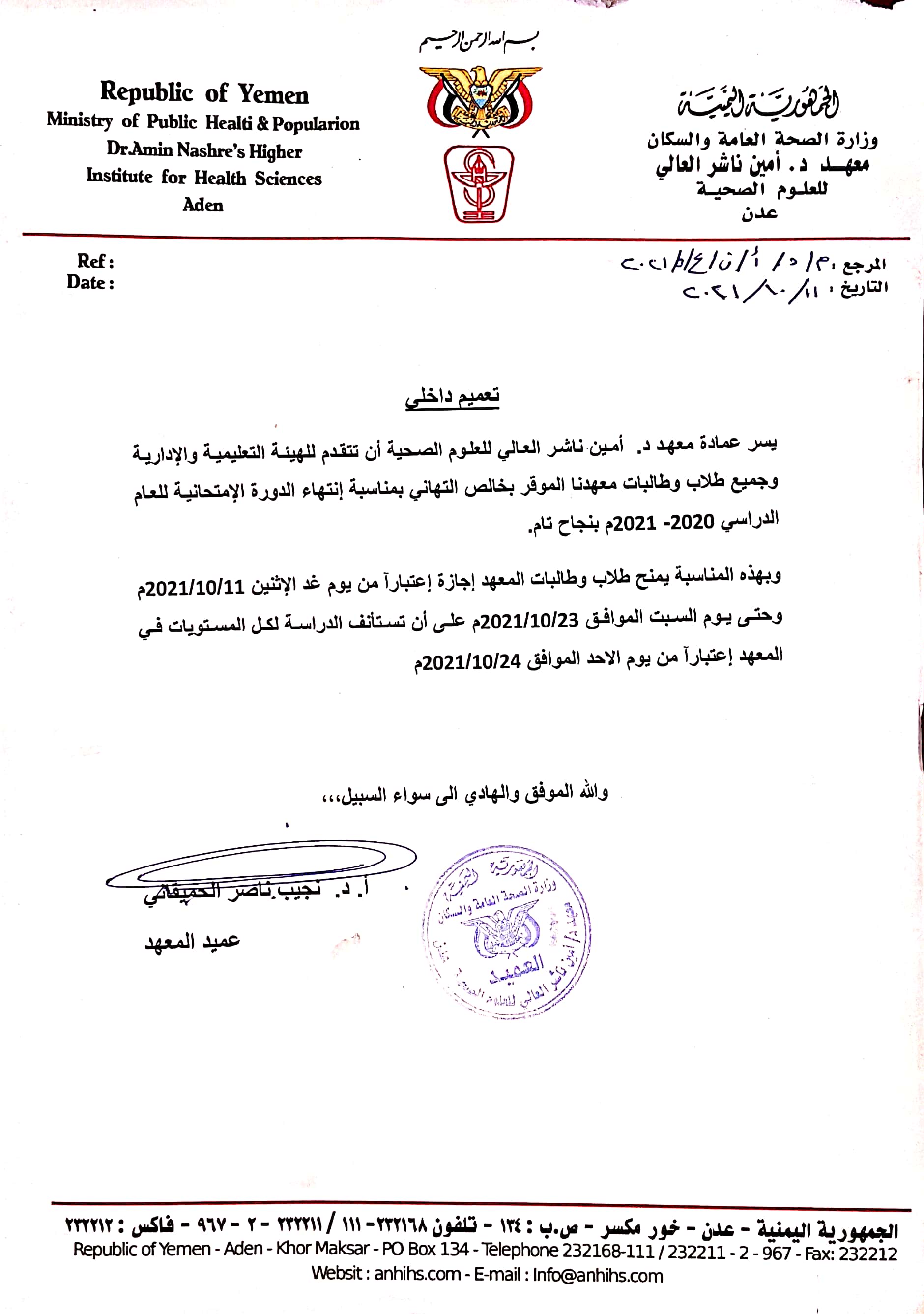 تعميم داخلي بخصوص بدء و نهاية إجازة طلاب وطالبات المعهد عقب الدورة الامتحانية الاخيرة