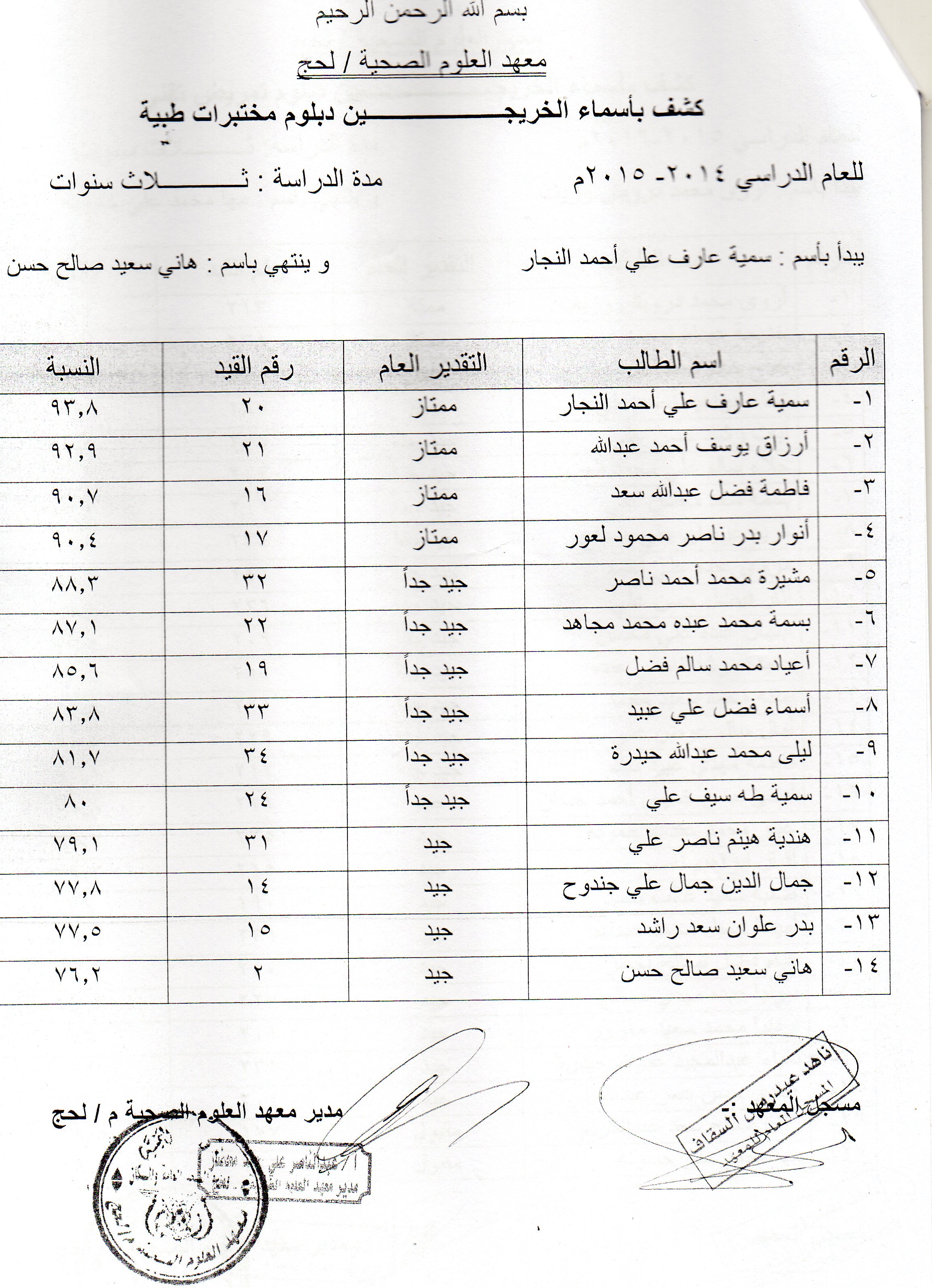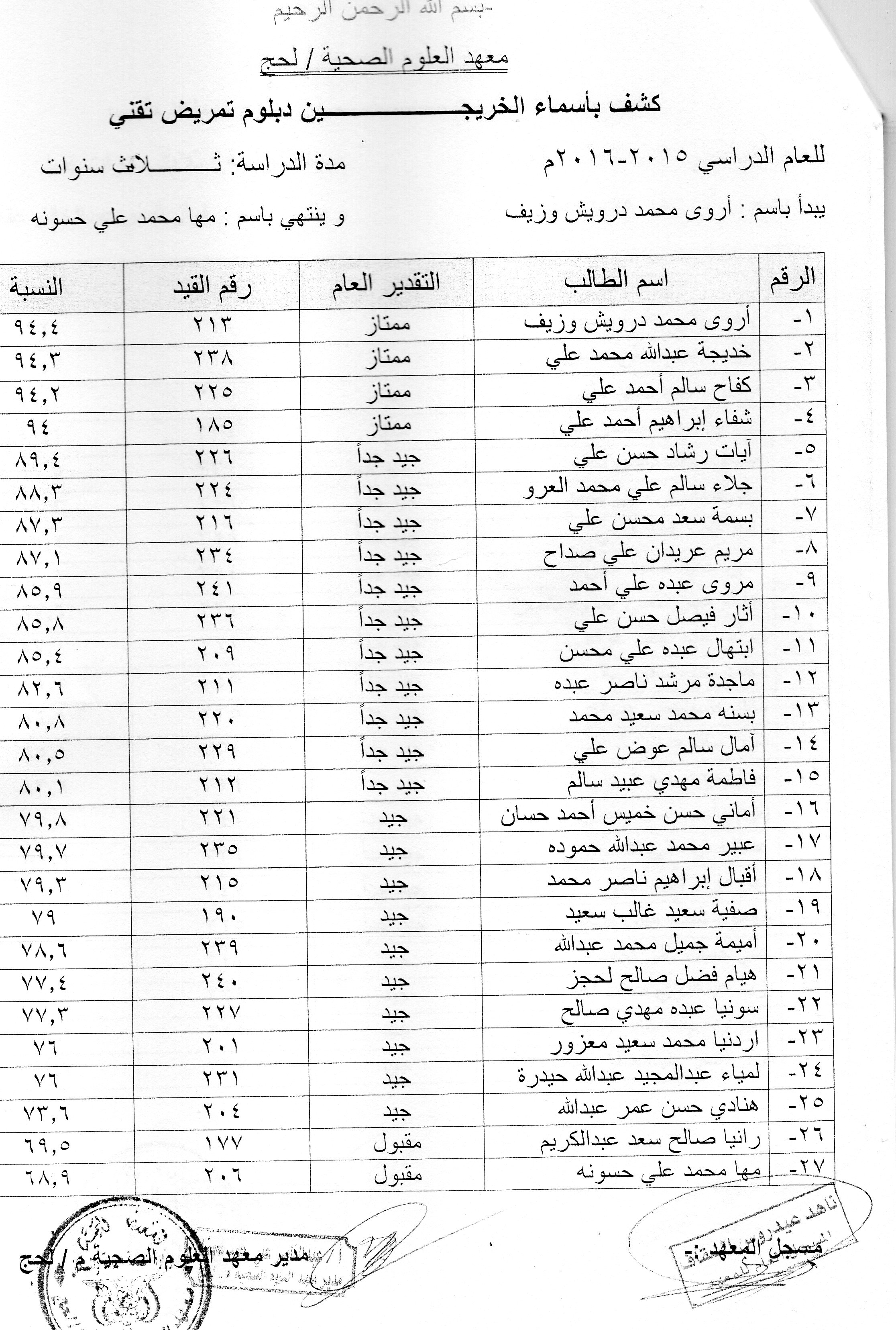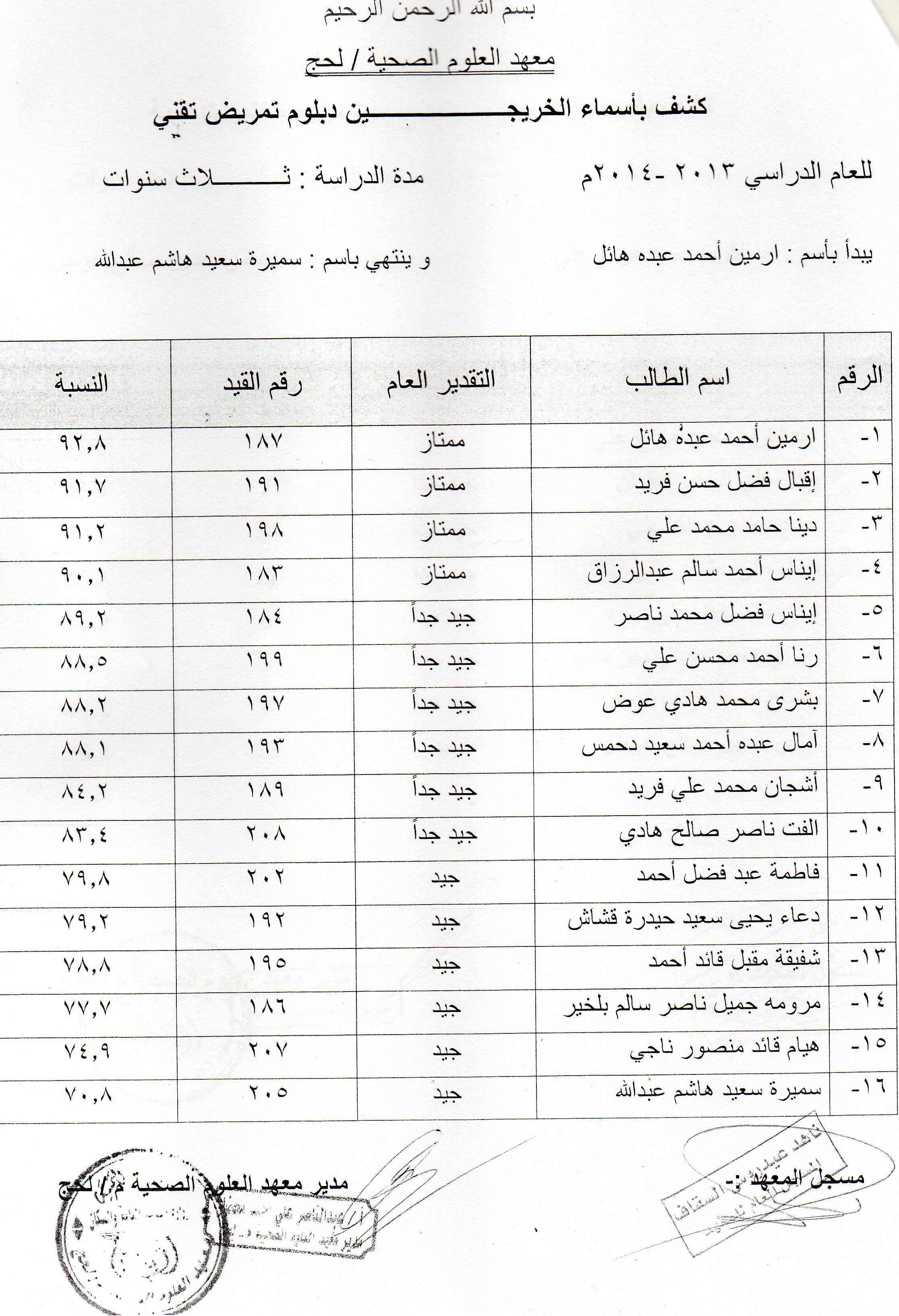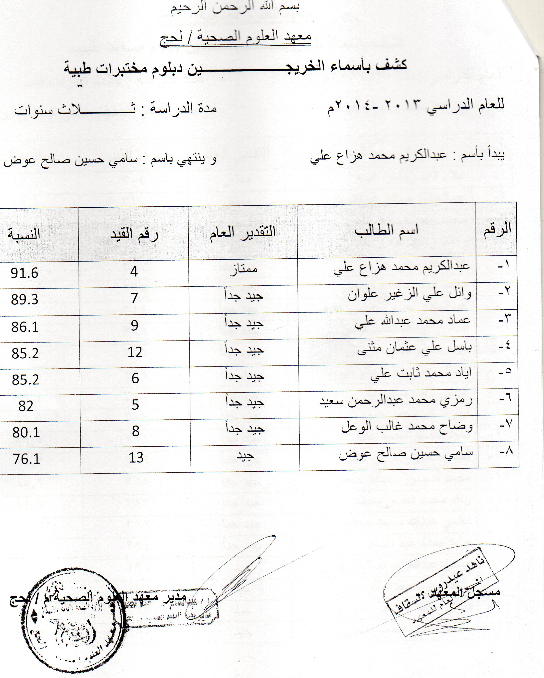 يعلن معهد العلوم الصحية في محافظة لحج عن دعوته لخريجي المعهد الوارد أسمائهم في الكشوفات التالية للحضور و إستلام شهاداتهم من مقر المعهد الفرعي في محافظة لحج