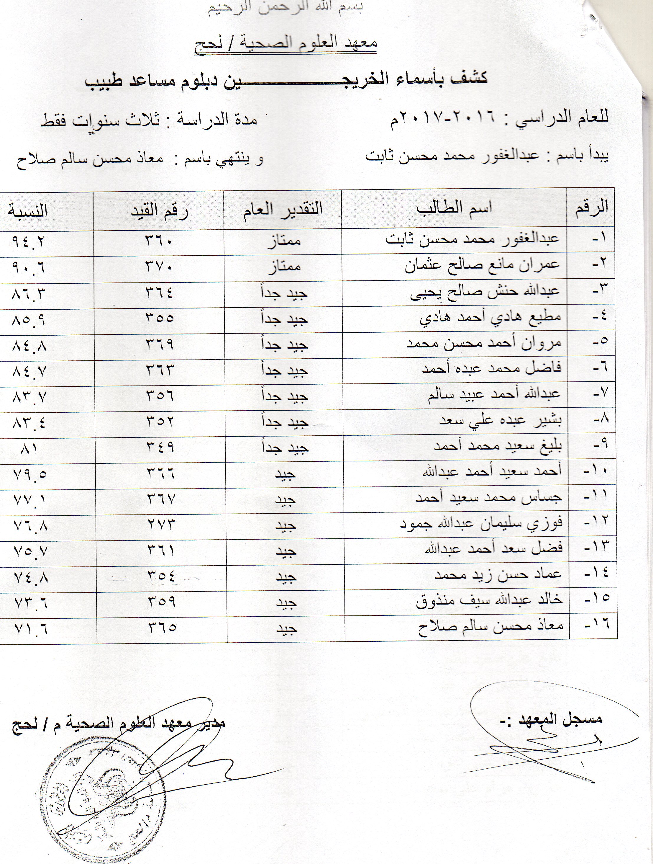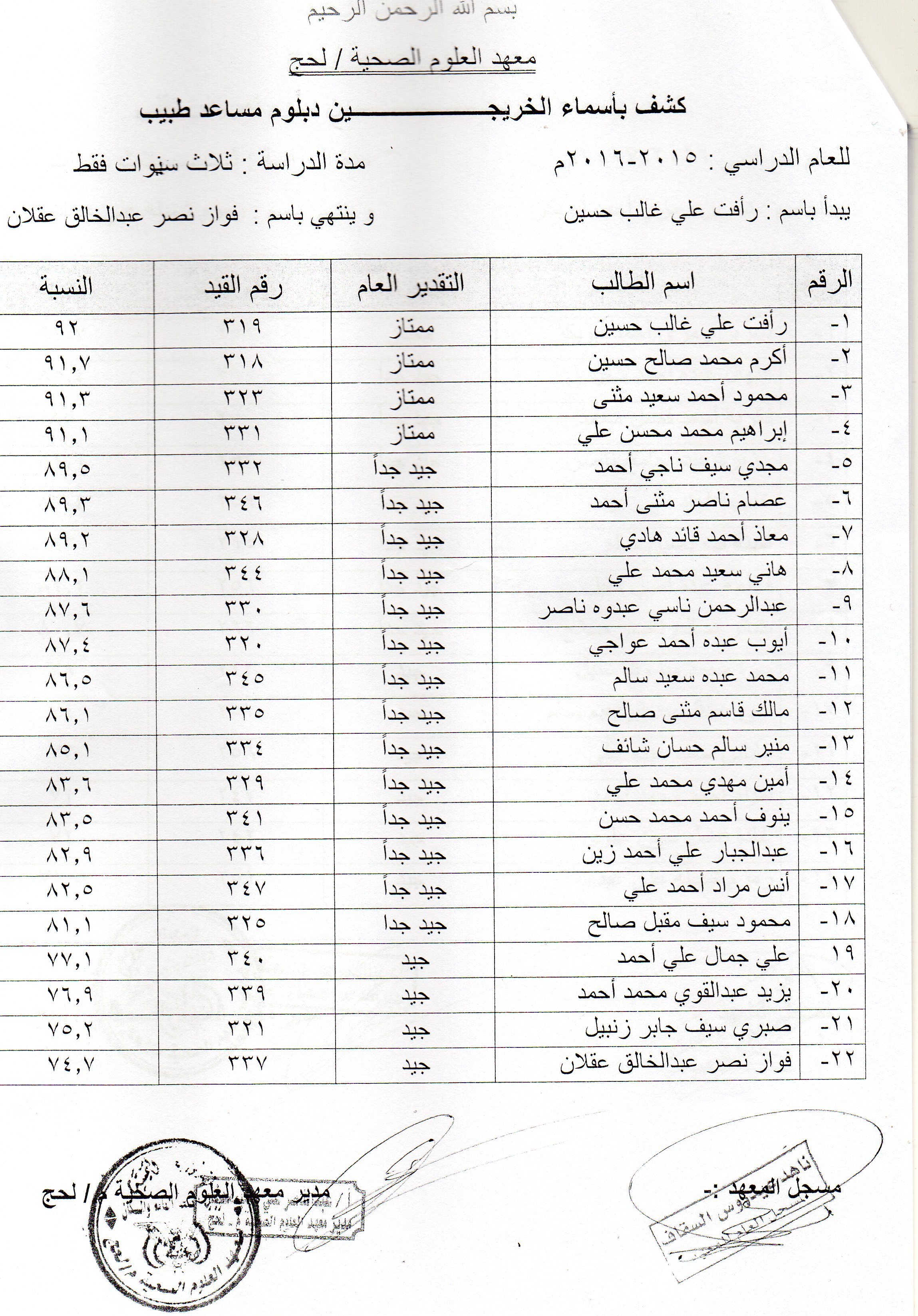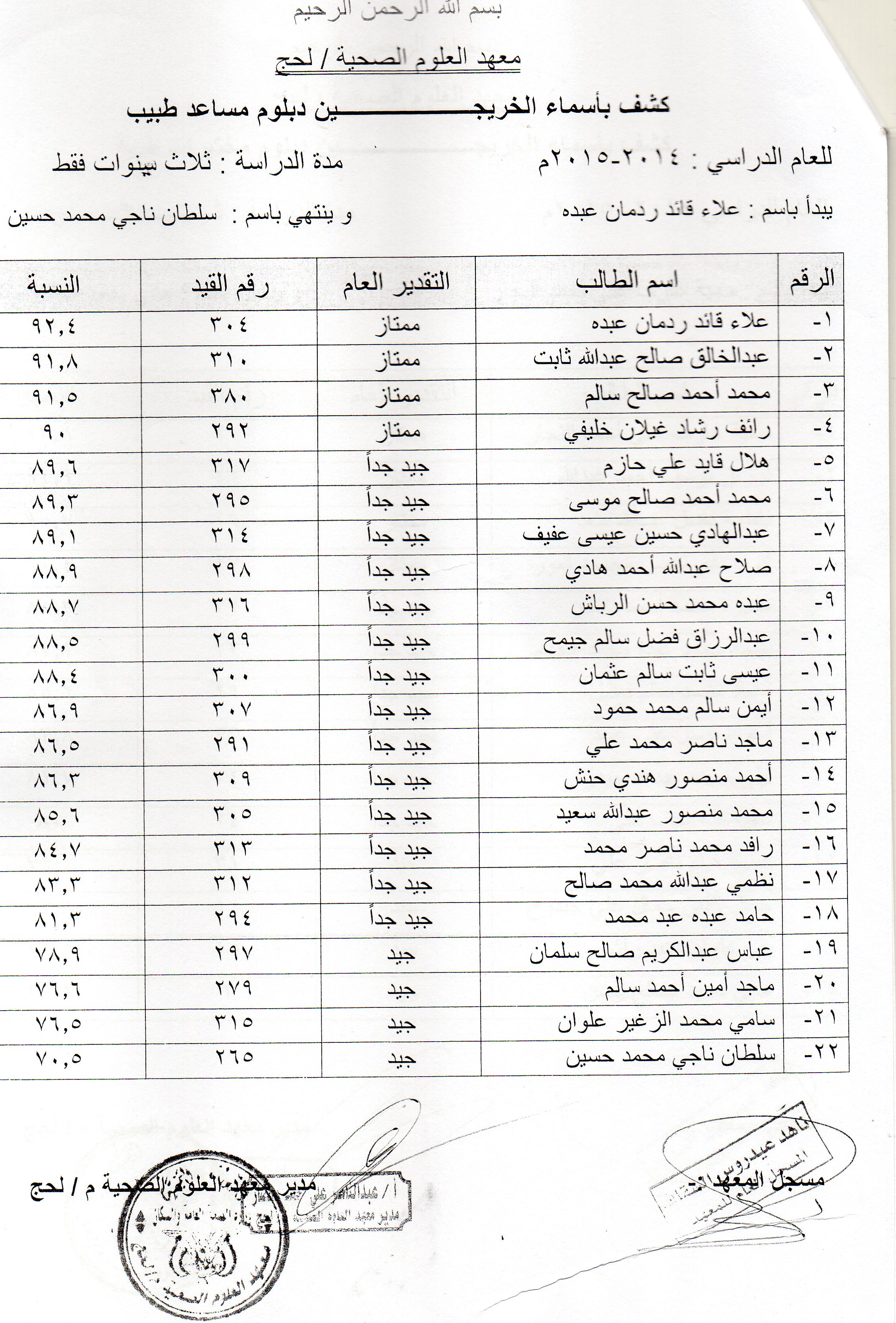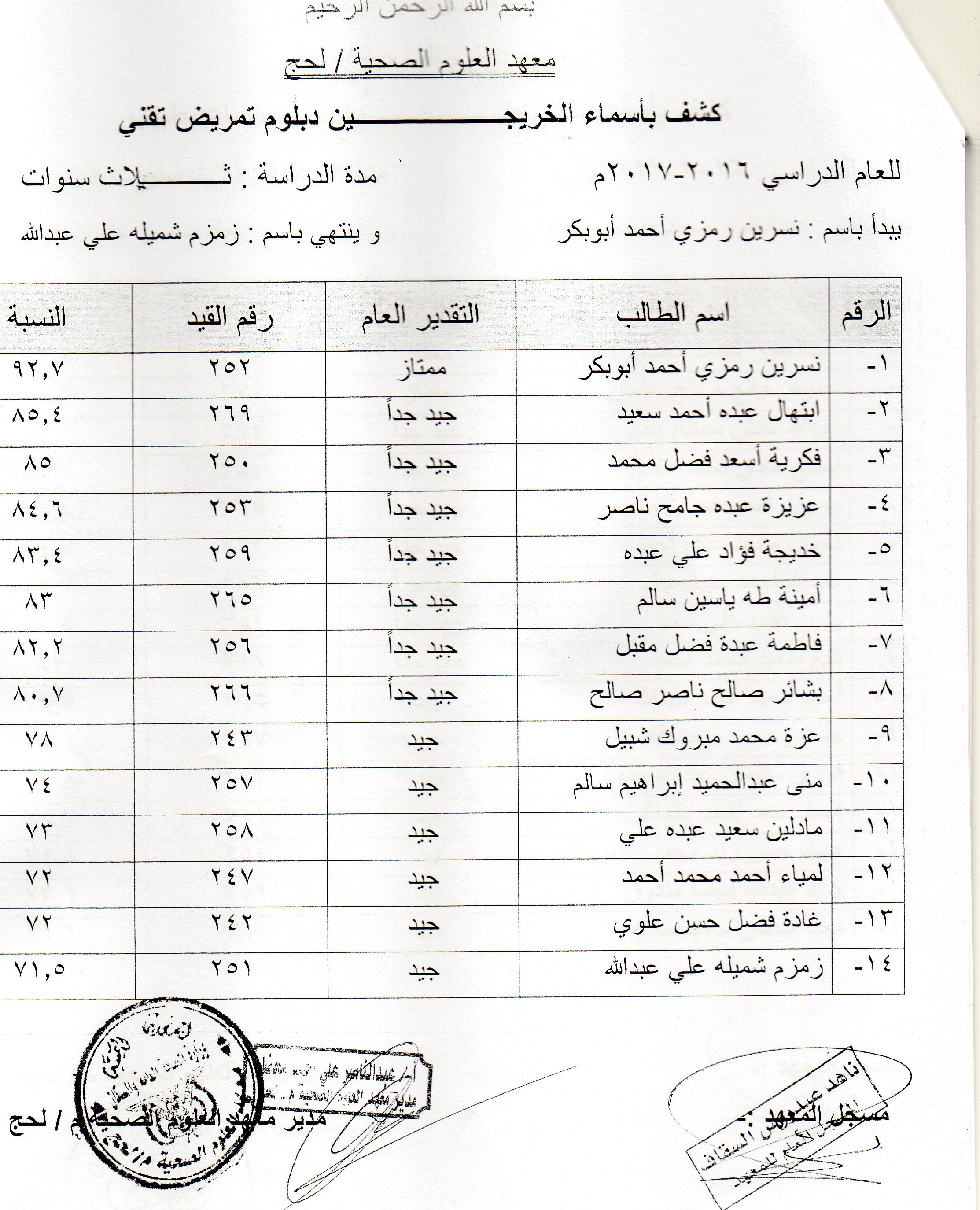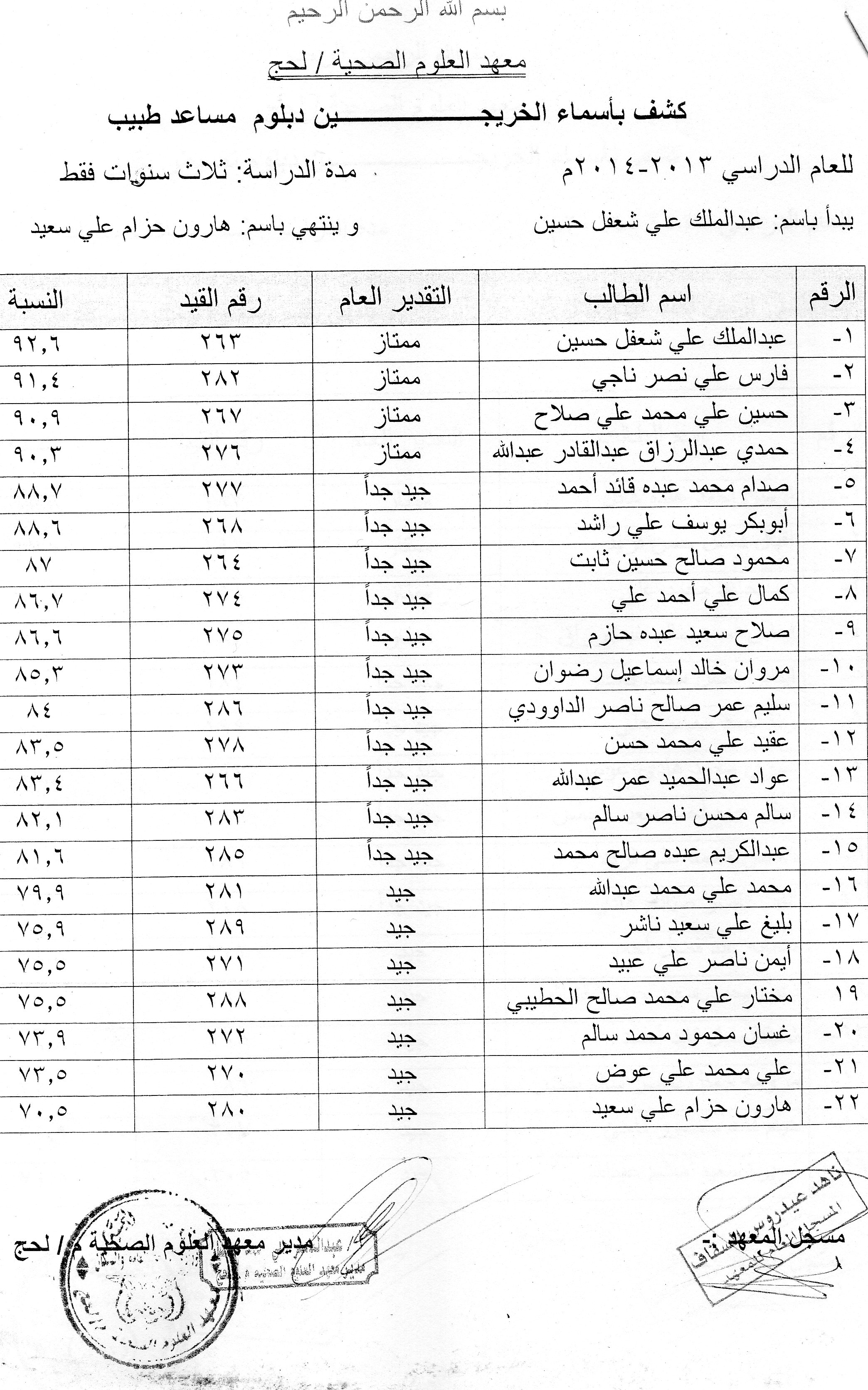 يعلن معهد العلوم الصحية في محافظة لحج عن دعوته لخريجي المعهد الوارد أسمائهم في الكشوفات التالية للحضور و إستلام شهاداتهم من مقر المعهد الفرعي في محافظة لحج