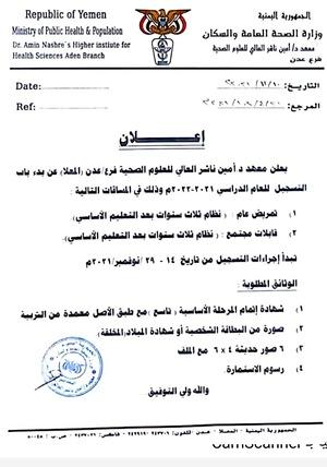 الاعلان عن بدء التسجيل في معهد د. أمين ناشر العالي للعلوم الصحية عدن (الكائن في المعلا)