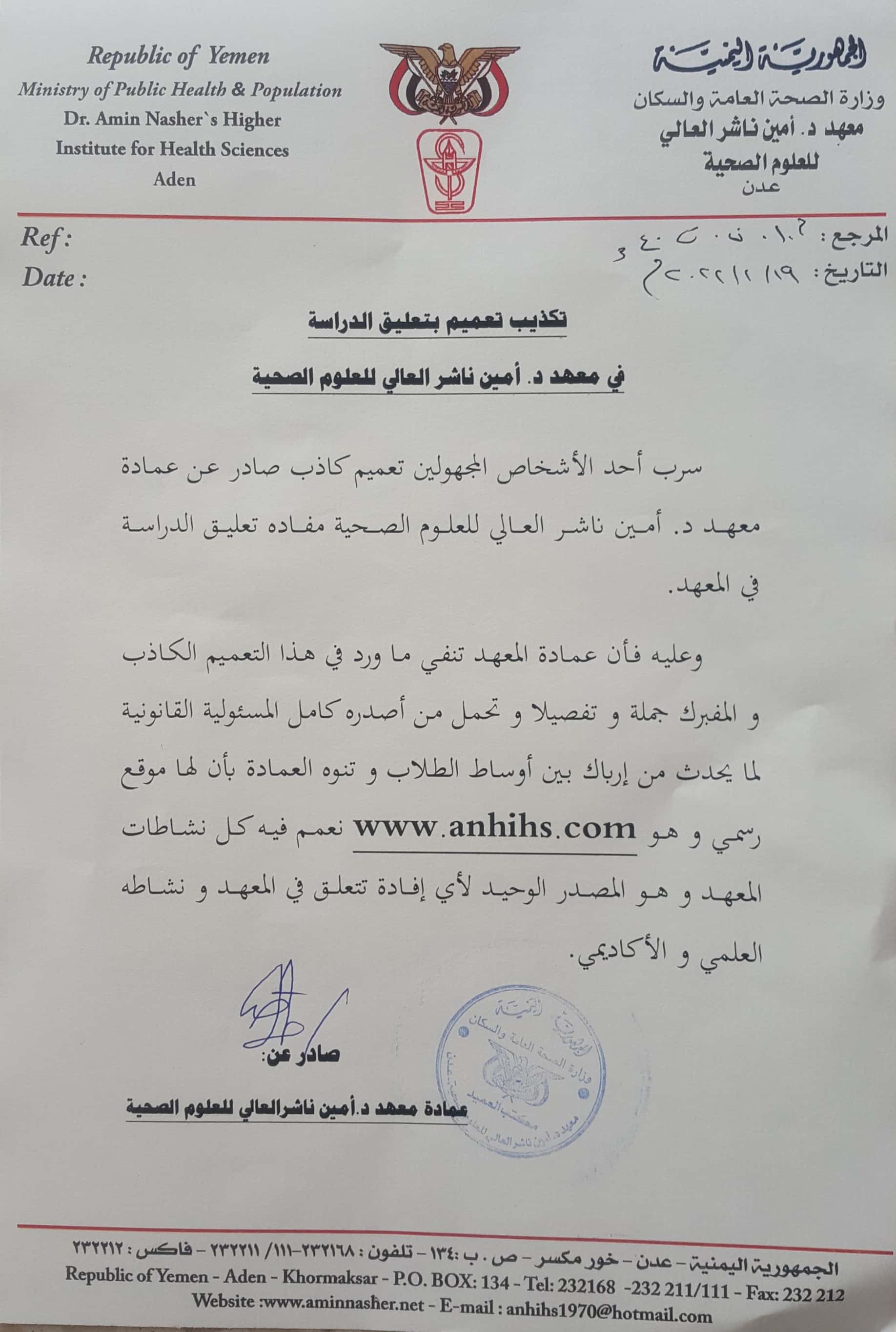 تكذيب تعميم بتعليق الدراسةفي معهد د. امين ناشر العالي للعلوم الصحية