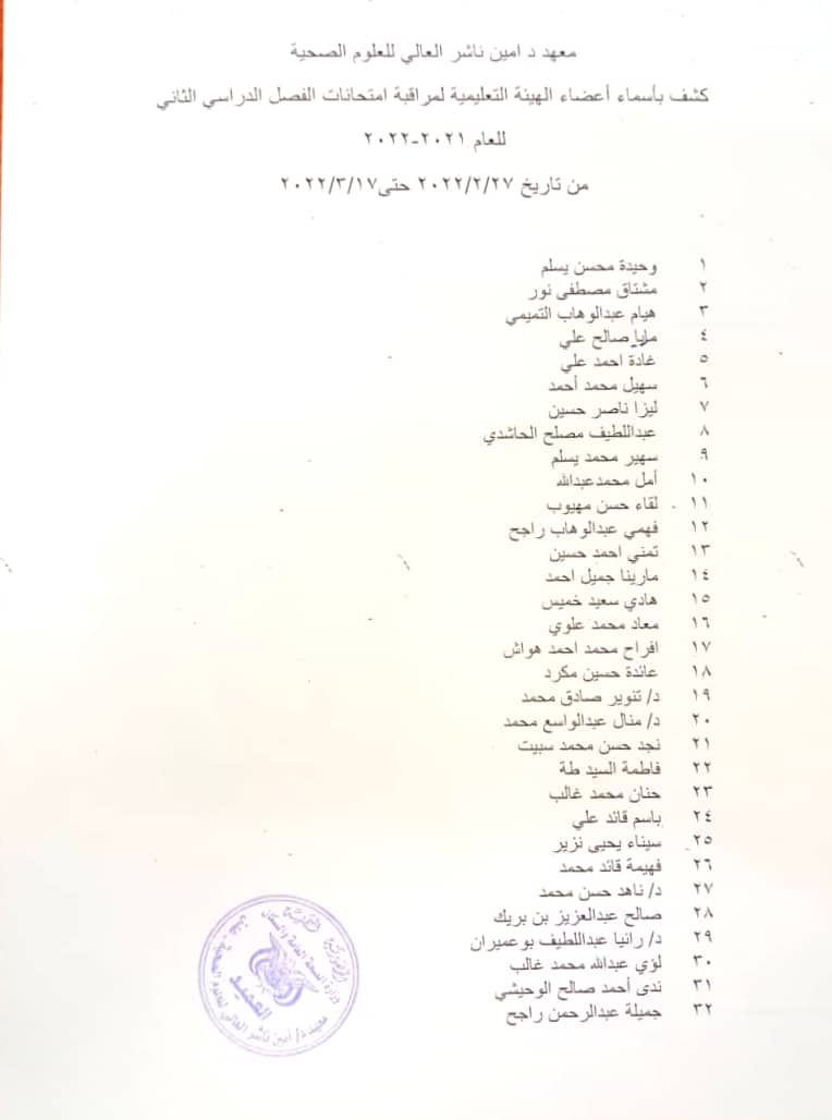 كشف بأسماء الهيئة التعليمية لمراقبة امتحانات الفصل الدراسي الثاني