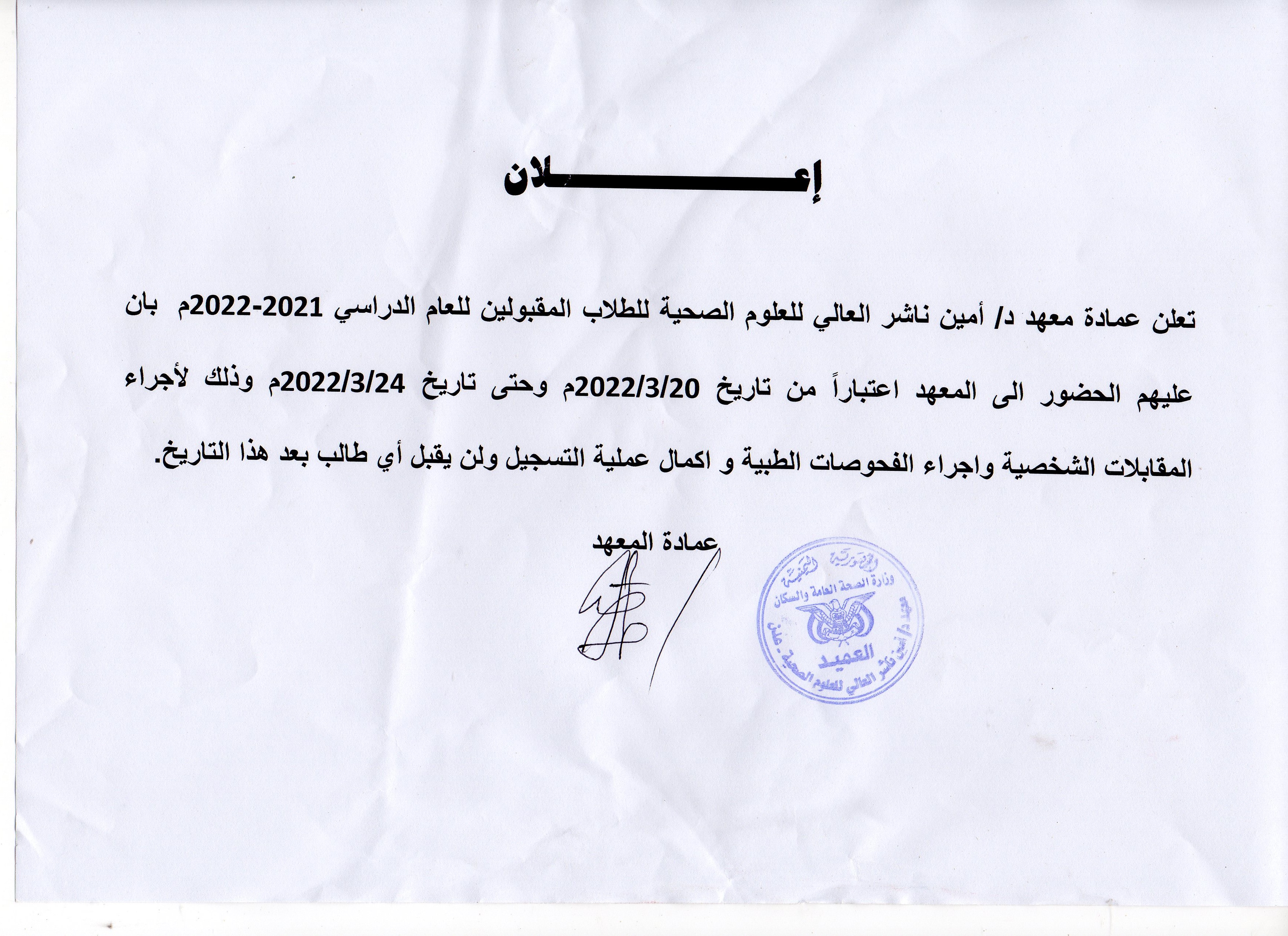 إعلان هام لجميع الطلاب المقبولين لاجراء المقابلات الشخصية و الفحوصات الطبية