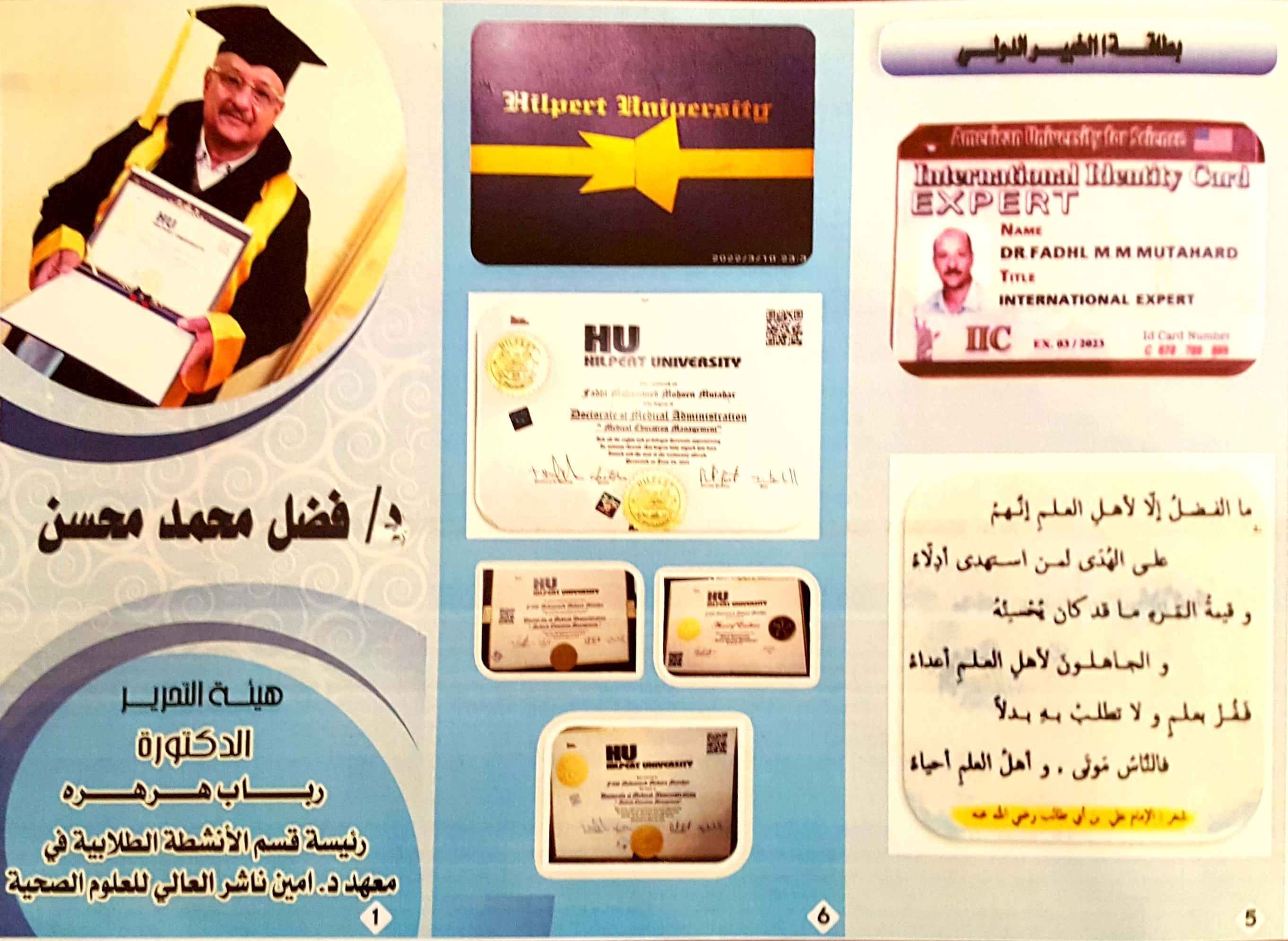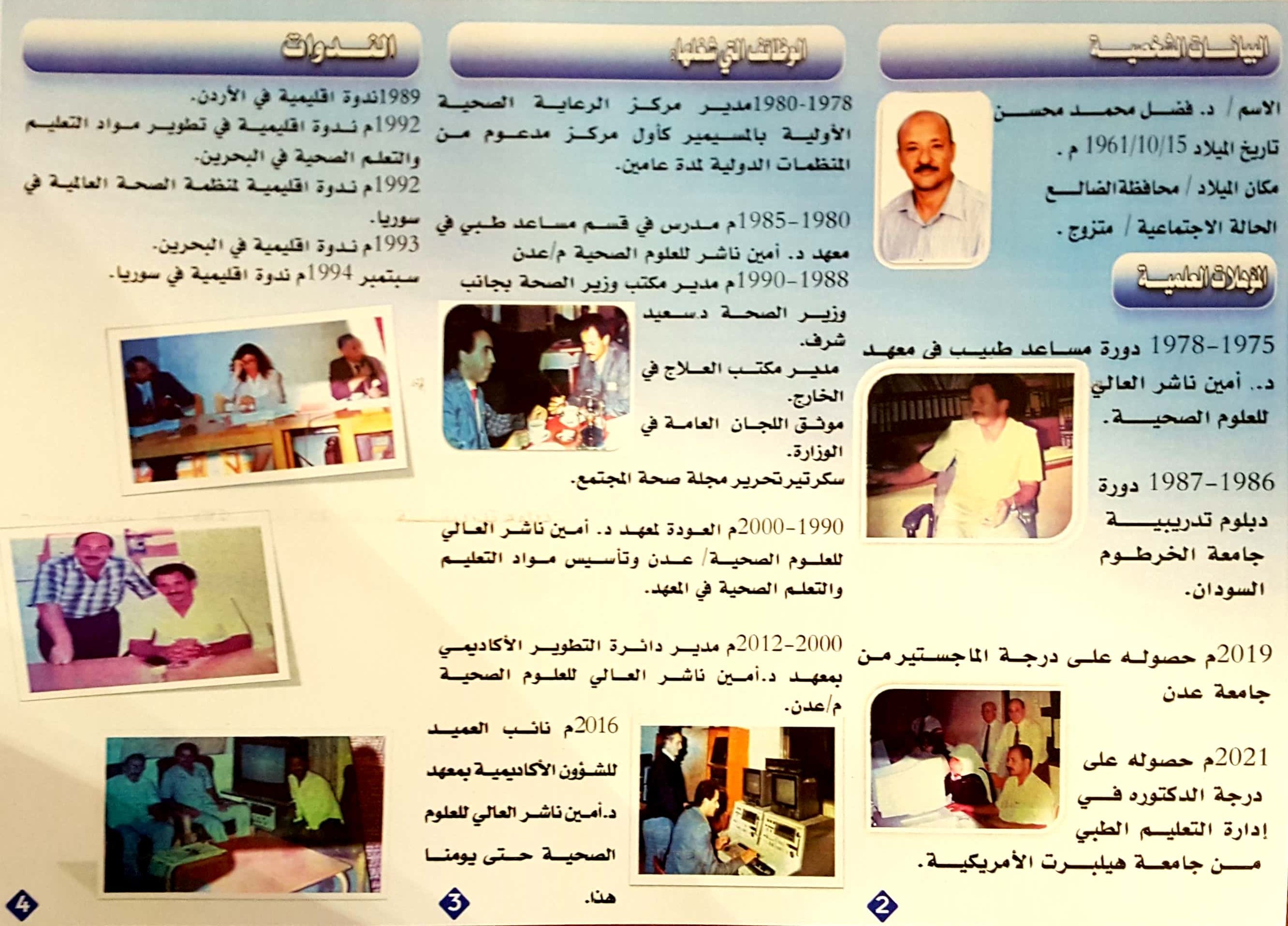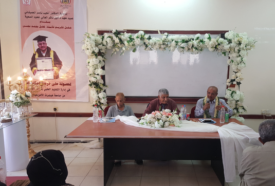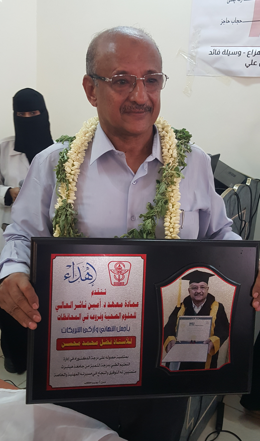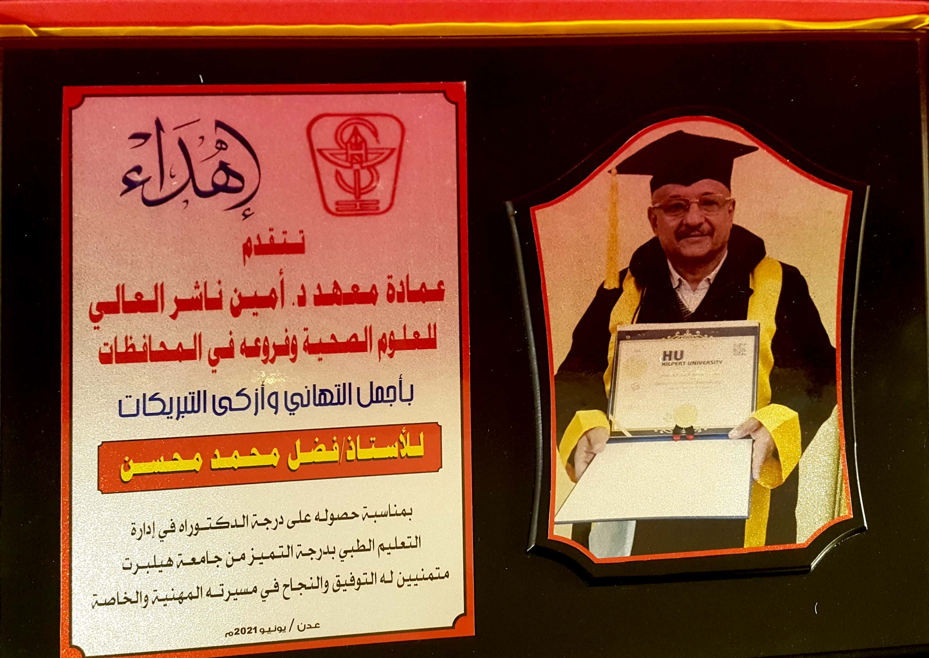 أقامت عمادة معهد الدكتور امين ناشر العالي للعلوم الصحية بالعاصمة المؤقتة عدن اليوم احتفالية تكريمية للدكتور فضل محمد محسن أحد أعضاء هيئة التدريس المبرزين بمناسبة نيلة درجة الدكتوراه بامتياز في إدارة التعليم الطبي المستمر من جامعة هيلبرت الأمريكية