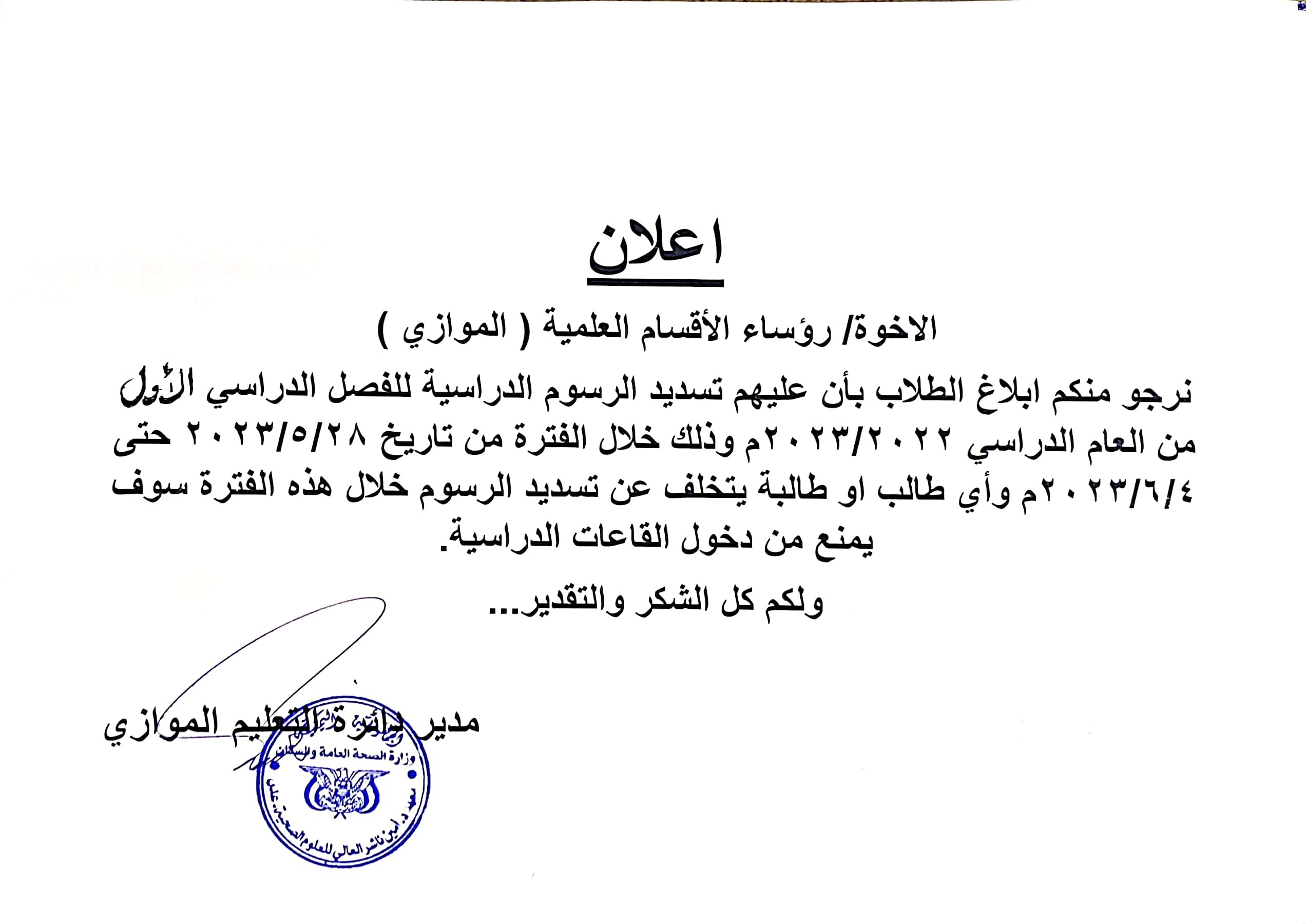 اعلان لرؤوساء الاقسام العلمية / الموازي حول تسديد الرسوم