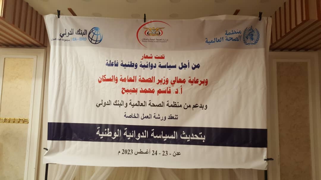 بدأت اليوم في عدن، فعاليات ورشة العمل الخاصة بمراجعة وتحديث السياسة الدوائية الوطنية التي تنظم بدعم من منظمة الصحة العالمية والبنك الدولي.