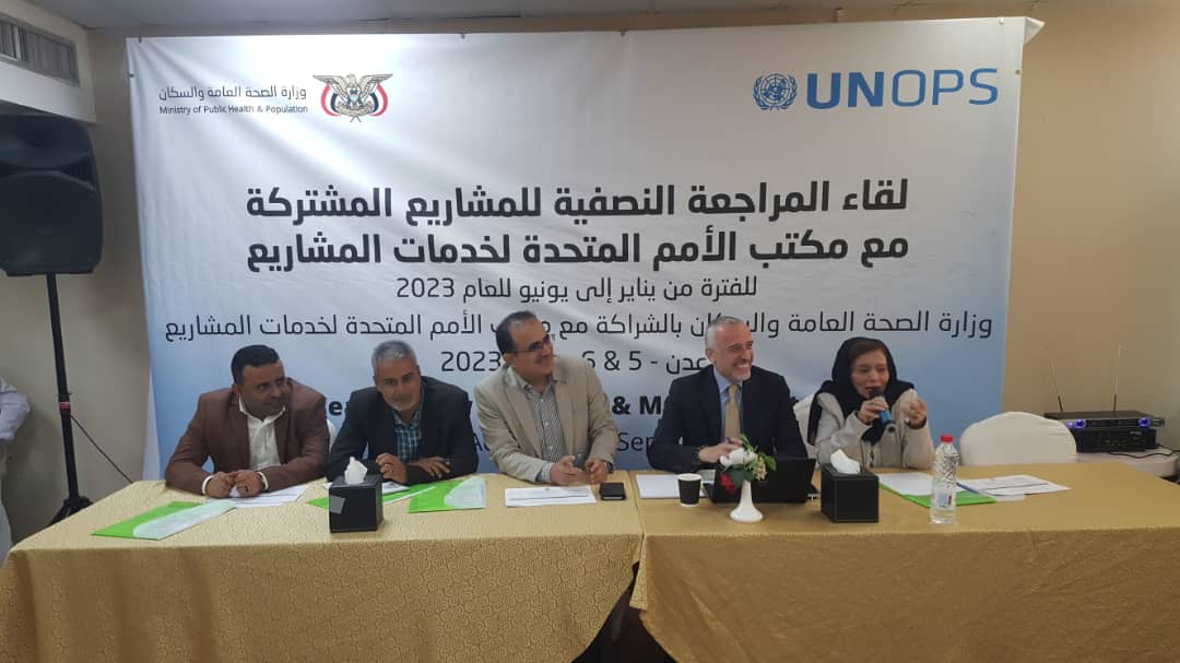 افتتح وزير الصحة العامة والسكان الدكتور قاسم محمد بحيبح بالعاصمة المؤقتة عدن اليوم فعاليات لقاء المراجعة النصفية للمشاريع المشتركة بين وزارة الصحة ومكتب الأمم المتحدة لخدمات المشاريع UNOPS.