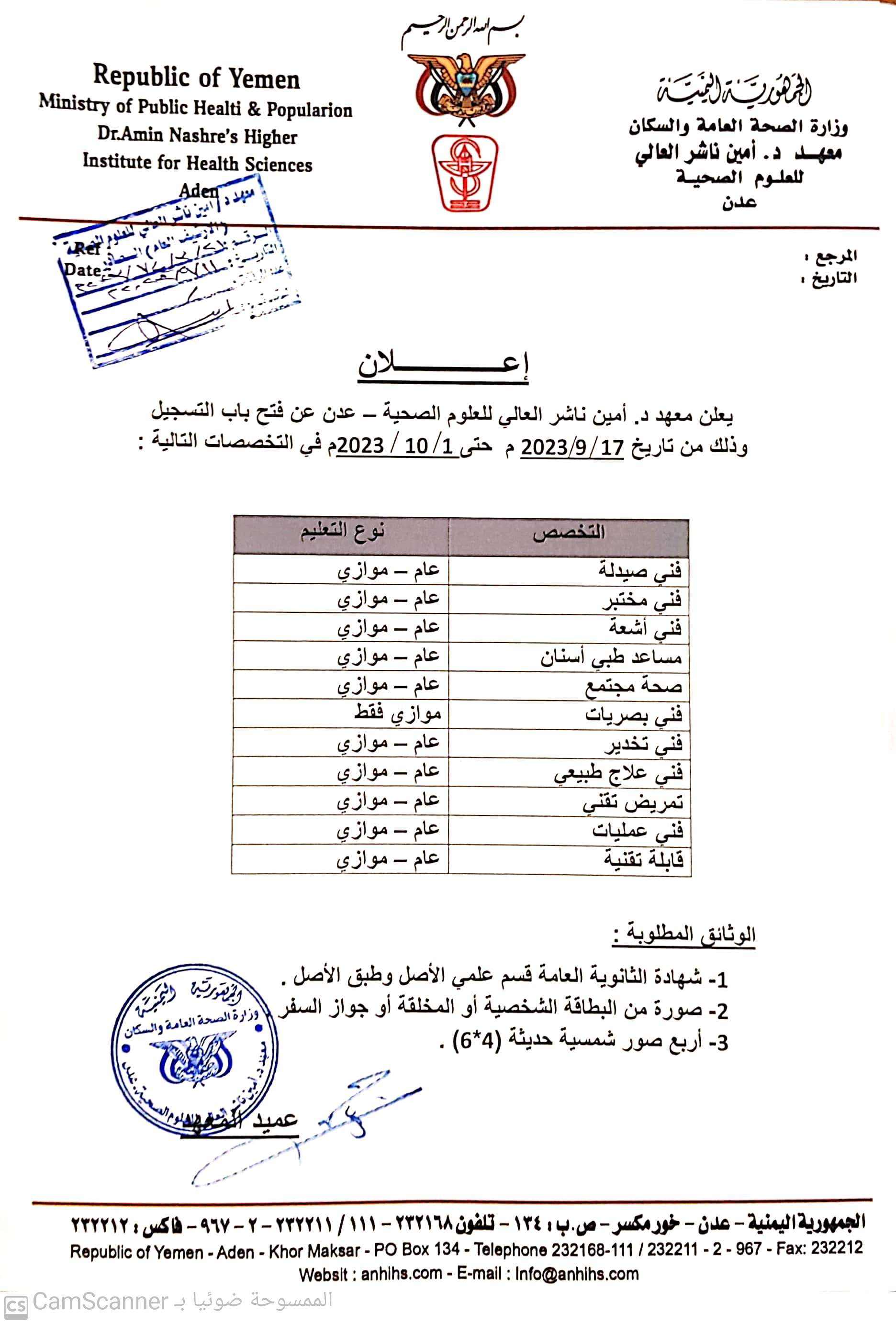 الاعلان عن فتح باب التسجيل للقبول بمعهد د. أمين ناشر العالي للعلوم الصحيةاعلان 2023-09-11zuhaer ahmad
