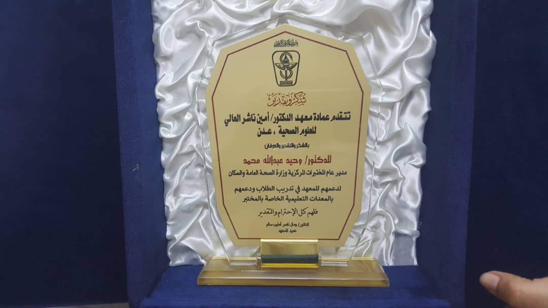 بتكليف من د. جمال ناصر امذيب عميد معهد د. أمين ناشر العالي للعلوم الصحية قام أ. احمد حامد المحضار نائب العميد لشئون الطلاب و الفروع بتكريم د. وحيد عبدالله محمد للباخشي مدير عام المختبرات المركزية وزارة الصحة العامة و السكان بدرع الشكر و التقدير و العرفان من المعهد لدعمه في تدريب الطلاب في المختبرات المركزية و دعمه بالمعدات التعليمية الخاصة بالمختبر ، ناقلا له شكر و امتنان و تقدير د. جمال ناصر امذيب عميد المعهد.
