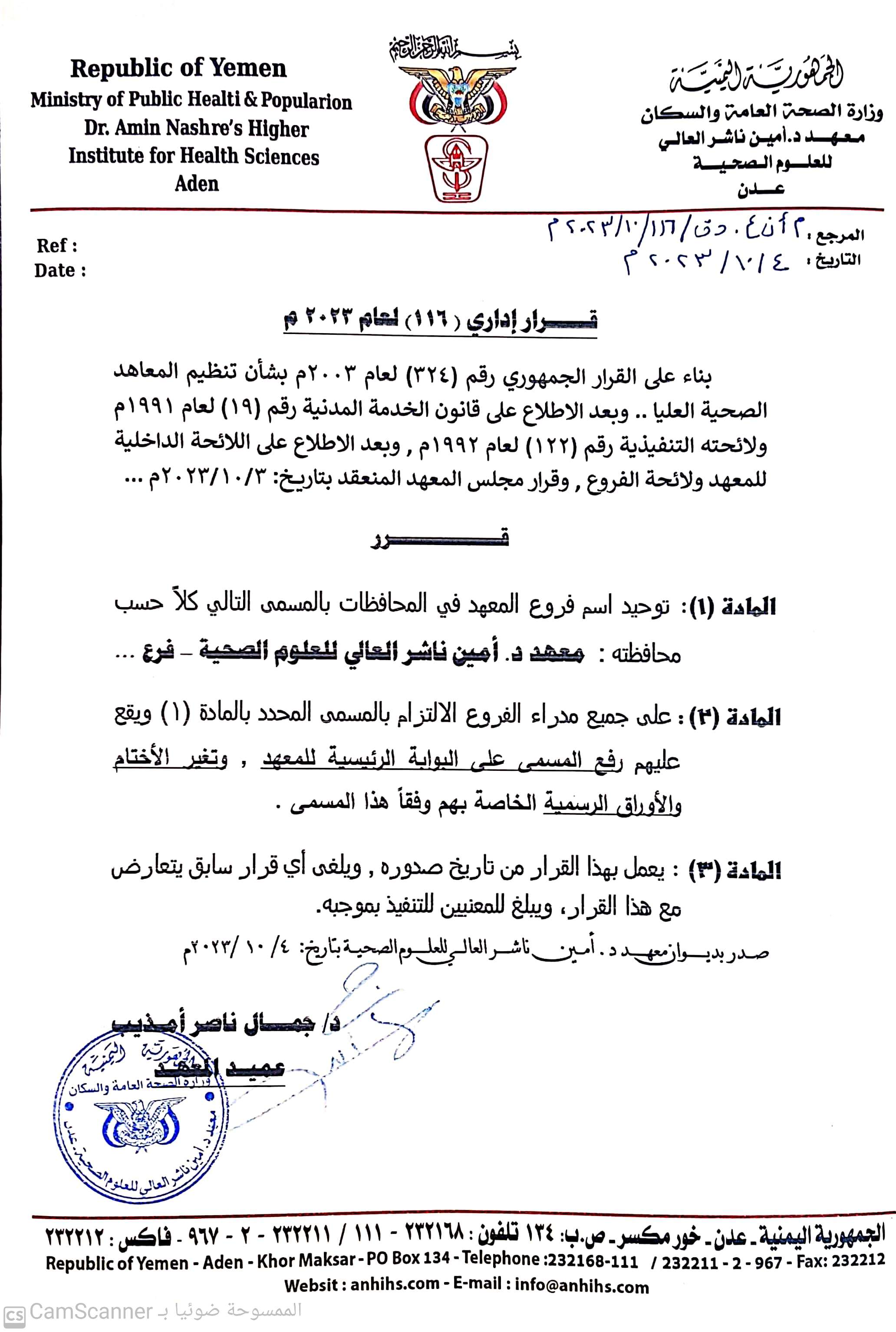 قرار اداري برقم 116 لعام 2023 بشأن توحيد اسم فروع المعهد في المحافظاتقرار اداري برقم 116 بشأن توحيد اسم فروع المعهد في المحافظات 2023-10-05zuhaer ahmad