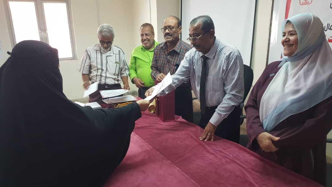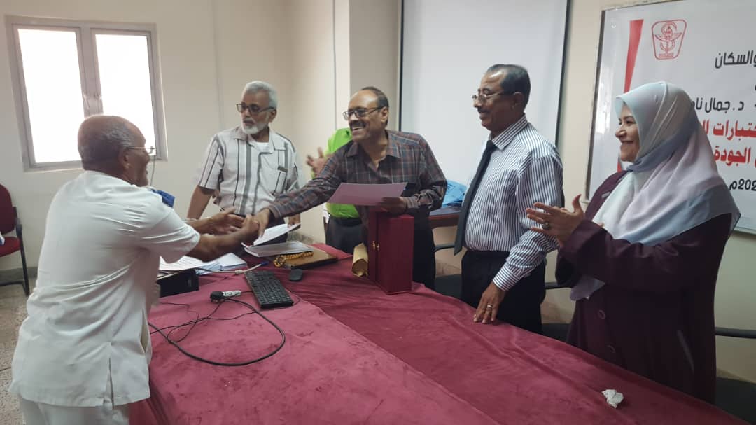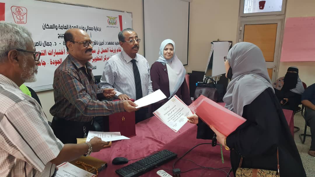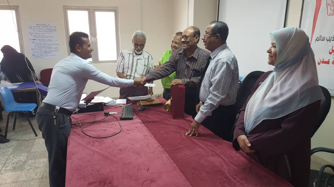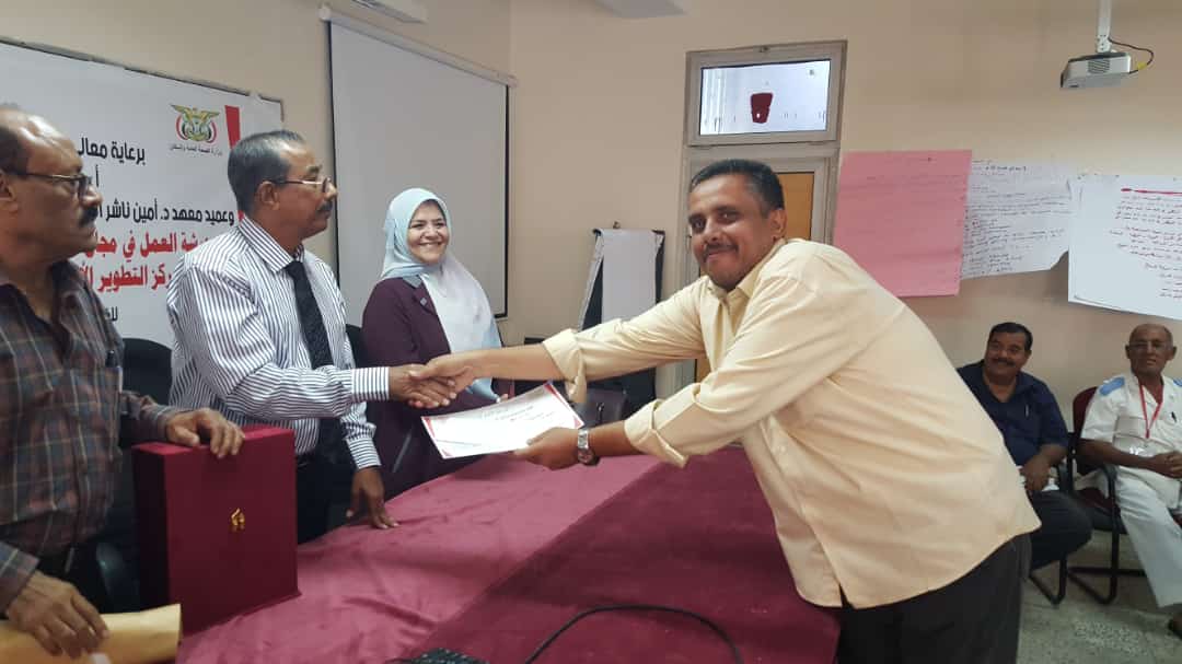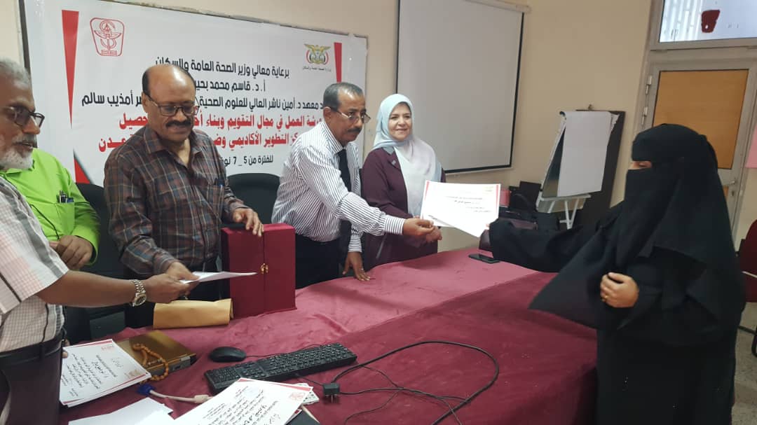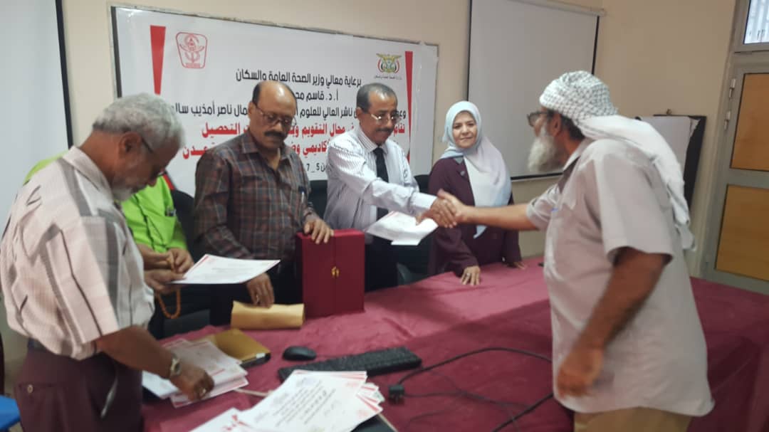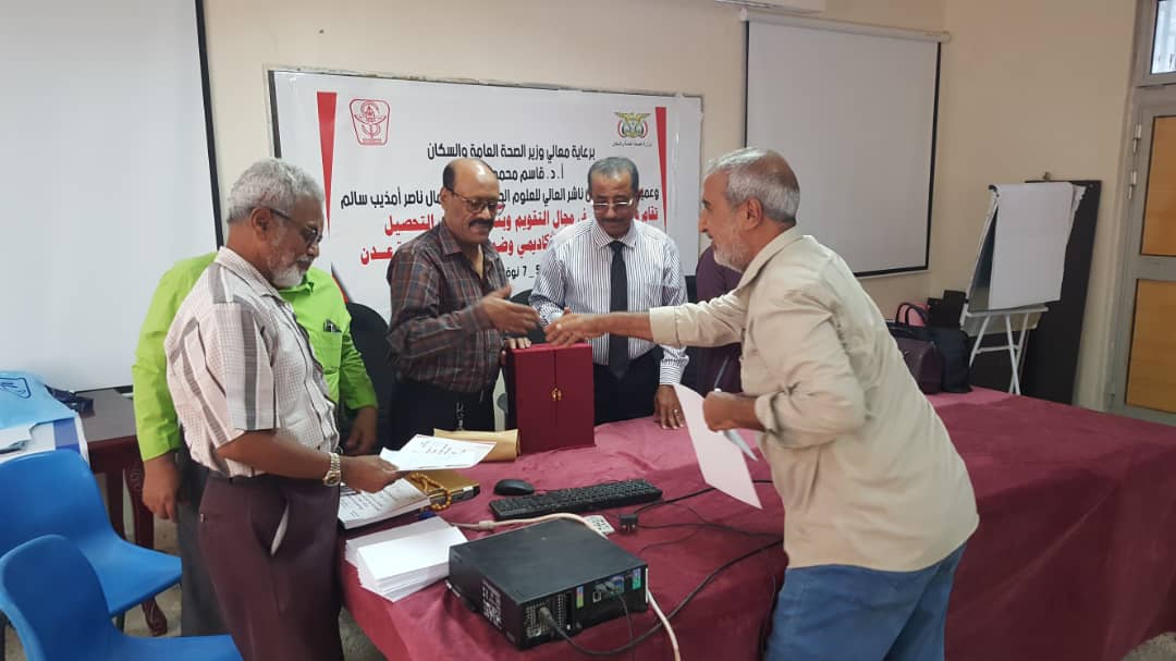 في ختام الورشة التدريبية قام د. جمال ناصر امذيب عميد المعهد و أ.د. عبد الوهاب عوض كويران و أ.د. ألطاف رمضان إبراهيم مدربي الورشة التدريبية بتوزيع شهادات المشاركة الفاعلة للمشاركين في ورشة العمل.