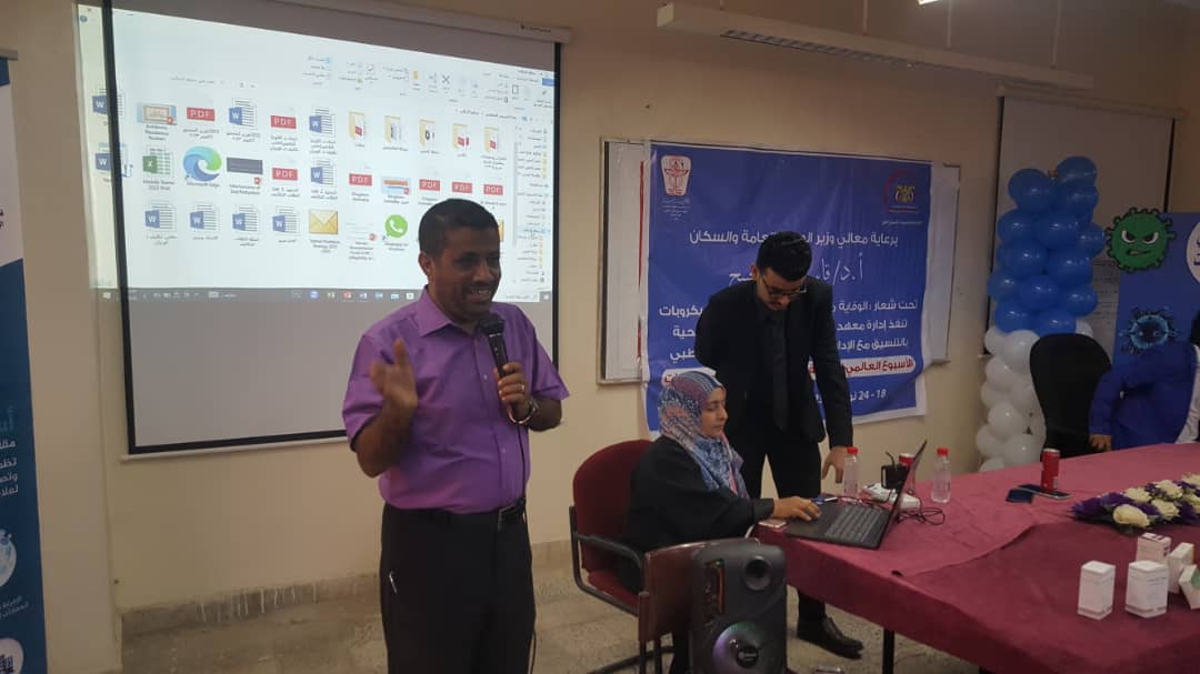 افتتح الفعالية د/ جمال ناصر امذيب عميد المعهد و دعى الى فهم شامل بمخاطر الاستخدام السيئ للمضادات الحيوية والتعريف بها وكيفية تجنبها.. مشيراً إلى أن الفهم الصحيح لمخاطر مضادات الميكروبات ياتي من التشخيص الصحيح للمرض وكتابة الوصفة الطبية المناسبة.. داعياً الجميع إلى التفاعل الإيجابي مع فعاليات أسبوع التوعية بمقاومة مضادات الميكروبات وانجاح اهدافه .