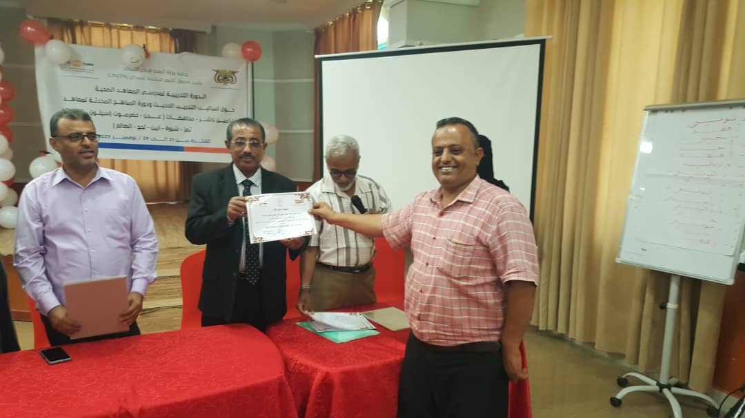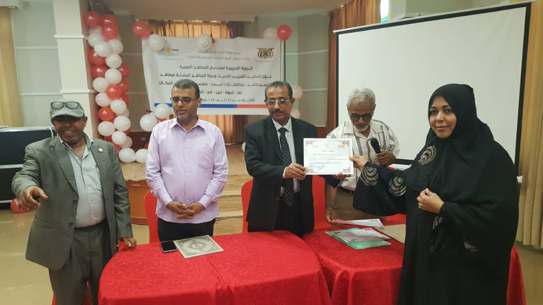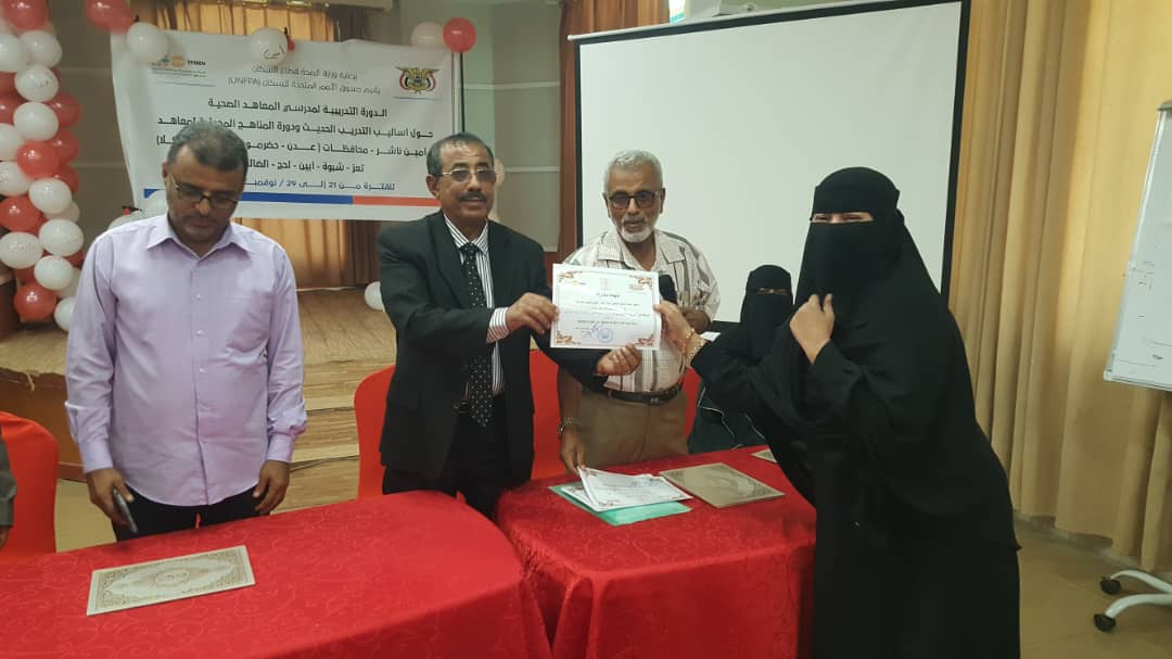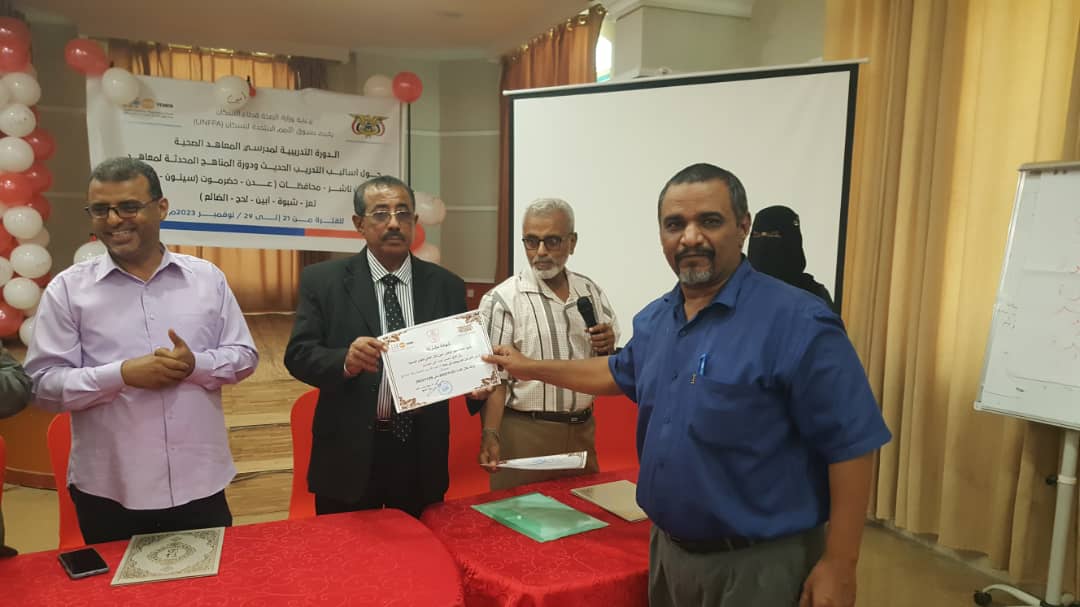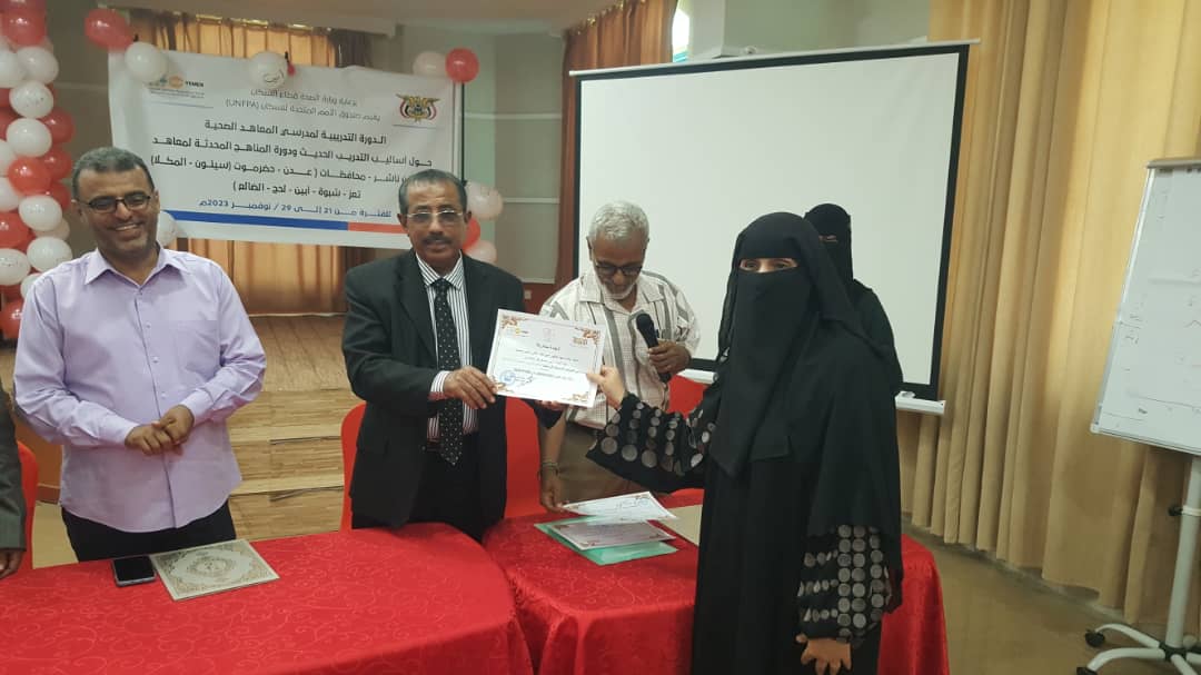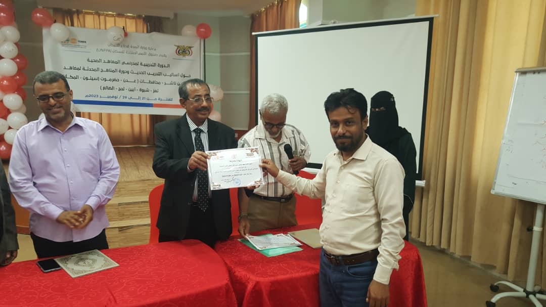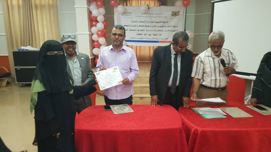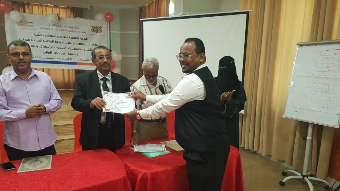 اختتمت اليوم الدورة التدريبية لمدرسي المعاهد الصحية حول أساليب التدريب الحديث و تحديث المناهج لمعاهد د/ أمين ناشر العالي للعلوم الصحية – محافظات (عدن – حضرموت (سيئون – المكلا) شبوة – أبين – لحج – الضالع – تعز) للفترة من 21 الى 29 نوفمبر 2023 م و التي تتم برعاية وزارة الصحة العامة والسكان بدعم من صندوق الأمم المتحدة للسكان ( UNFPA ).