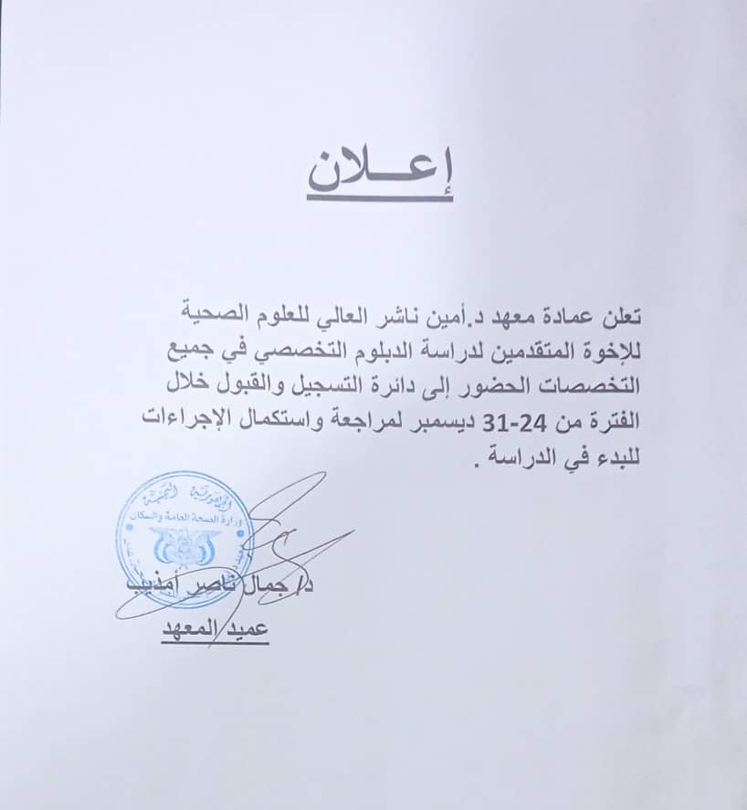 اعلان للاخوة المتقدمين للدبلومات التخصصية للحضور لاستكمال الاجراءات للبدء بالدراسةاعلان 2023-12-22zuhaer ahmad