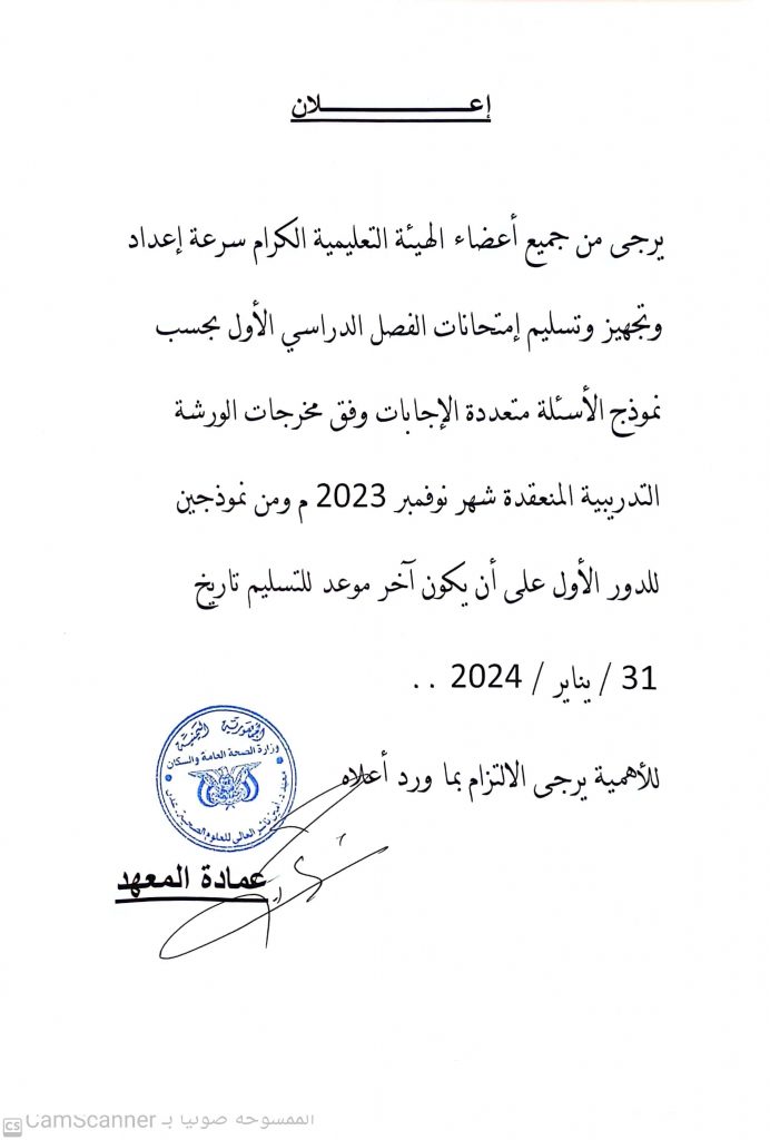 توجيه لأعضاء الهيئة التعليمية بسرعة اعداد وتسليم امتحانات الفصل الاول وفق نموذج الاسئلة المتعددةالاجابات قبل ٣١ / ١ / ٢٠٢٤