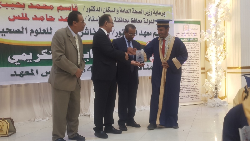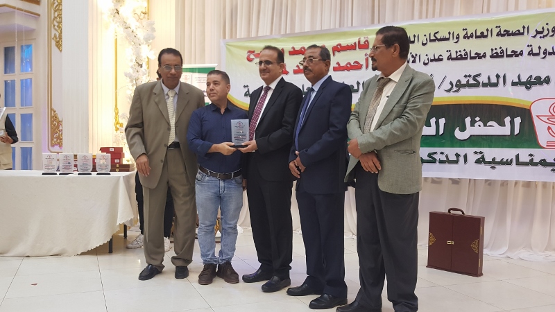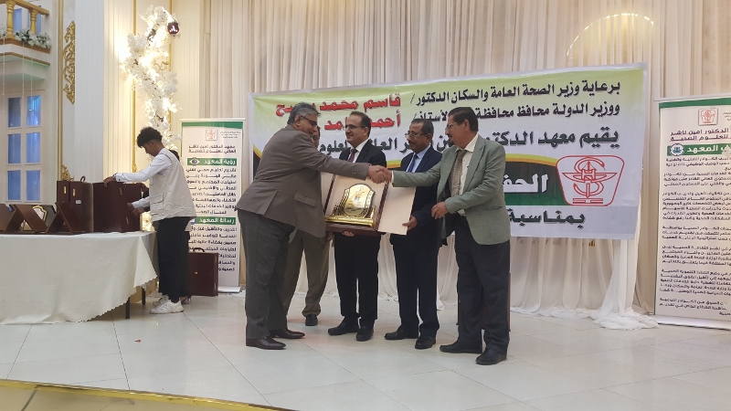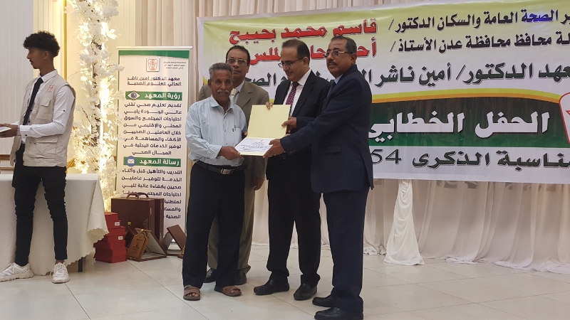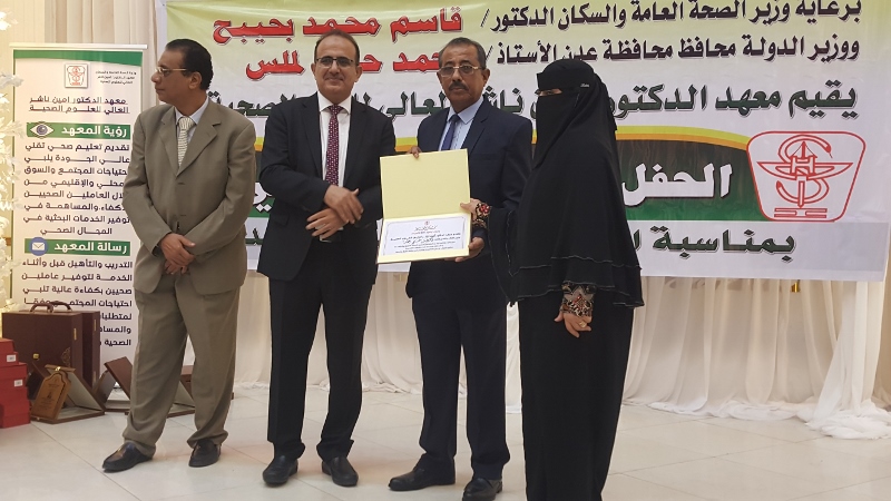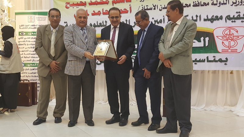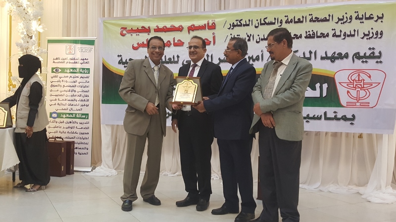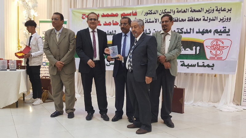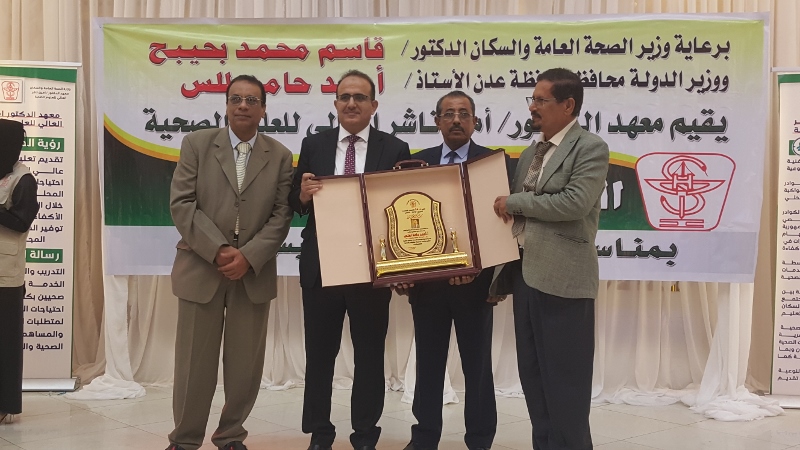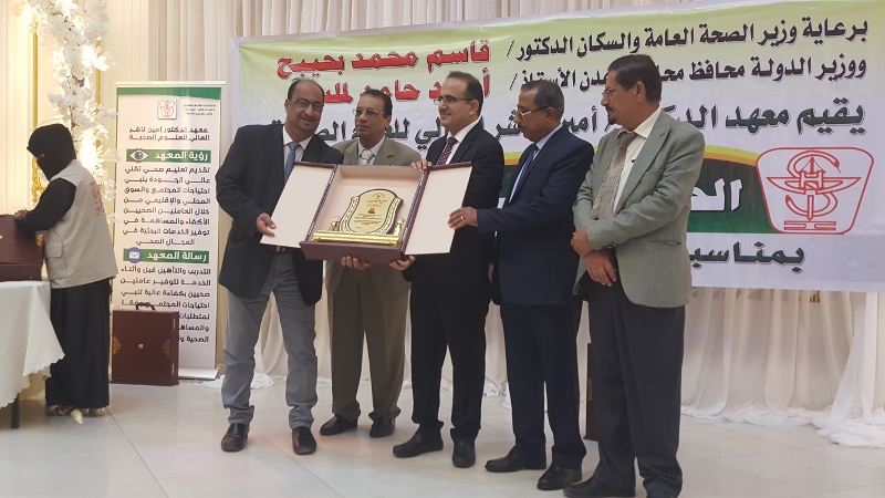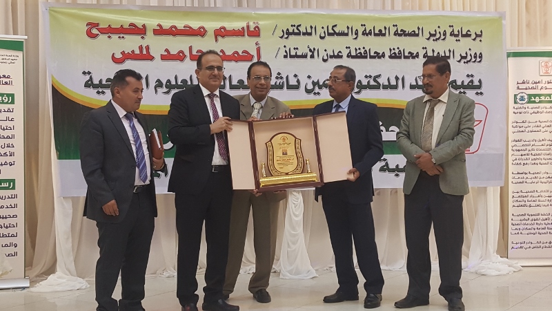 وفي ختام الحفل كرم معالي وزير الصحة الدكتور/ قاسم بحيبح و الدكتور/ جمال ناصر امذيب عميد معهد أمين ناشر محافظ محافظة عدن الأخ أحمد لملس بدرع استلمها نيابة عنه عبدالحكيم الشعيبي وكيل محافظة عدن والدكتور/ أحمد مثنى البيشي مدير عام مكتب الصحة العامة والسكان بعدن والدكتور /عبدالقادر الباكري المدير التنفيذي للهيئة العليا للأدوية والمستلزمات الطبية والدكتور/ الخضر لصور رئيس جامعة عدن والدكتورة /إشراق السباعي وكيل مساعد لوزارة الصحة والدكتورة/ رجاء مسعد مدير عام مستشفى الصداقة التعليمي، كما تم تكريم شخصيات تعاقبت على عمادة المعهد منذ تأسيسه وحتى الوقت الراهن على كرسي عمادة المعهد وعدد من الكفاءات المشهود لها، وعدد من الدكاترة والأكاديميين وأساتذة المعهد بشهادات تقديرية تقديراً لجهودهم ودعمهم ومتابعتهم المتواصلة لتطوير العملية التعليمية في المعهد.