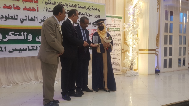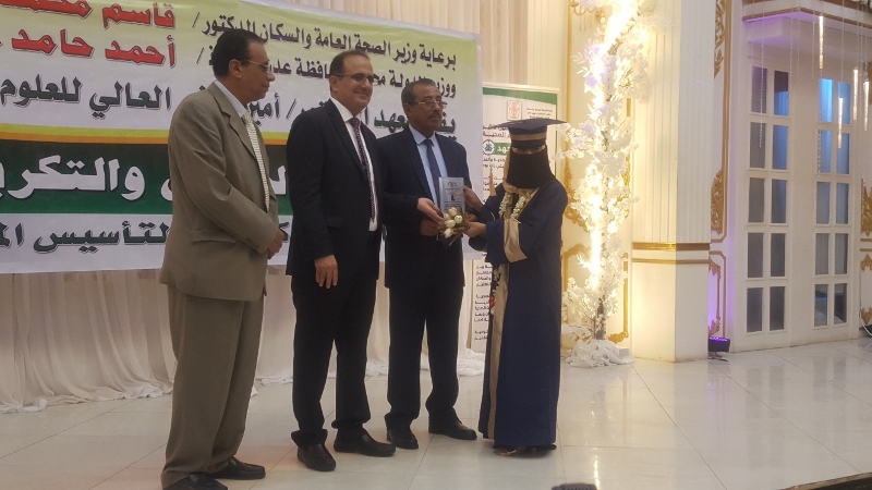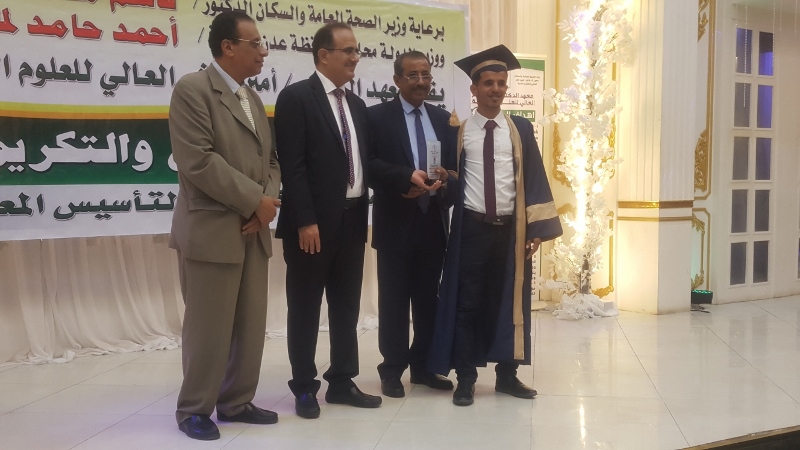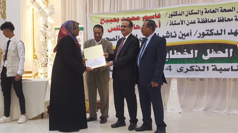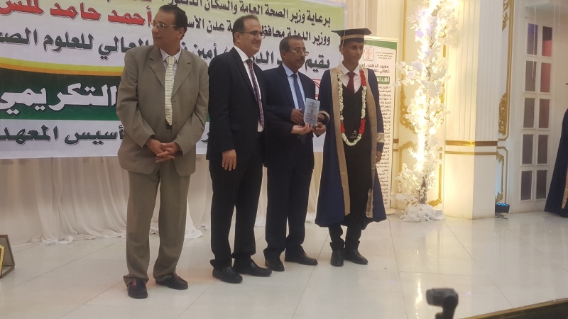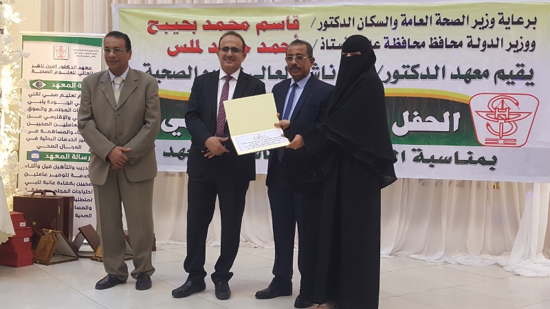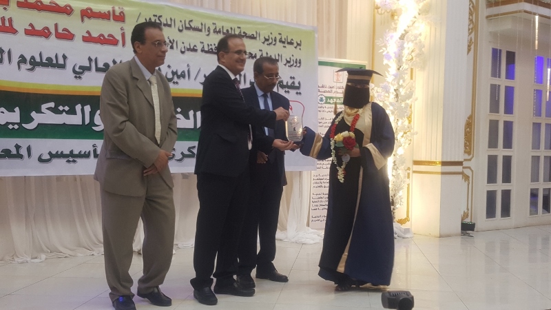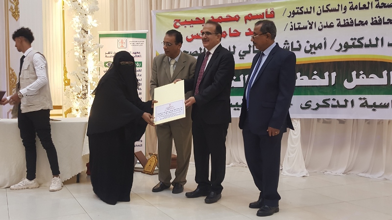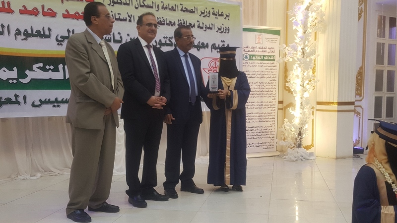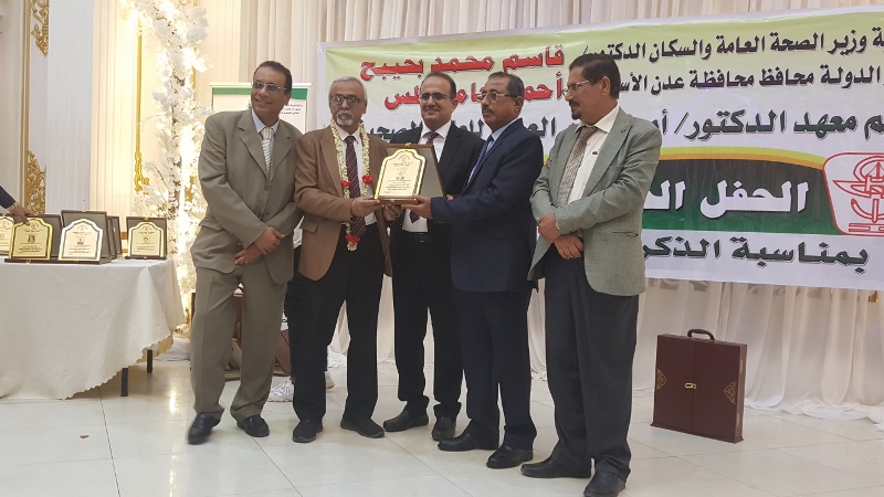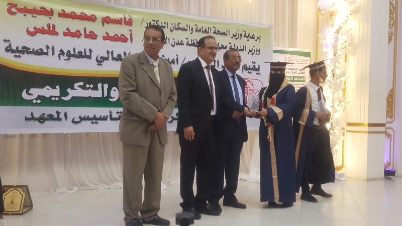 وفي ختام الحفل كرم معالي وزير الصحة الدكتور/ قاسم بحيبح و الدكتور/ جمال ناصر امذيب عميد معهد أمين ناشر محافظ محافظة عدن الأخ أحمد لملس بدرع استلمها نيابة عنه عبدالحكيم الشعيبي وكيل محافظة عدن والدكتور/ أحمد مثنى البيشي مدير عام مكتب الصحة العامة والسكان بعدن والدكتور /عبدالقادر الباكري المدير التنفيذي للهيئة العليا للأدوية والمستلزمات الطبية والدكتور/ الخضر لصور رئيس جامعة عدن والدكتورة /إشراق السباعي وكيل مساعد لوزارة الصحة والدكتورة/ رجاء مسعد مدير عام مستشفى الصداقة التعليمي، كما تم تكريم شخصيات تعاقبت على عمادة المعهد منذ تأسيسه وحتى الوقت الراهن على كرسي عمادة المعهد وعدد من الكفاءات المشهود لها، وعدد من الدكاترة والأكاديميين وأساتذة المعهد بشهادات تقديرية تقديراً لجهودهم ودعمهم ومتابعتهم المتواصلة لتطوير العملية التعليمية في المعهد.