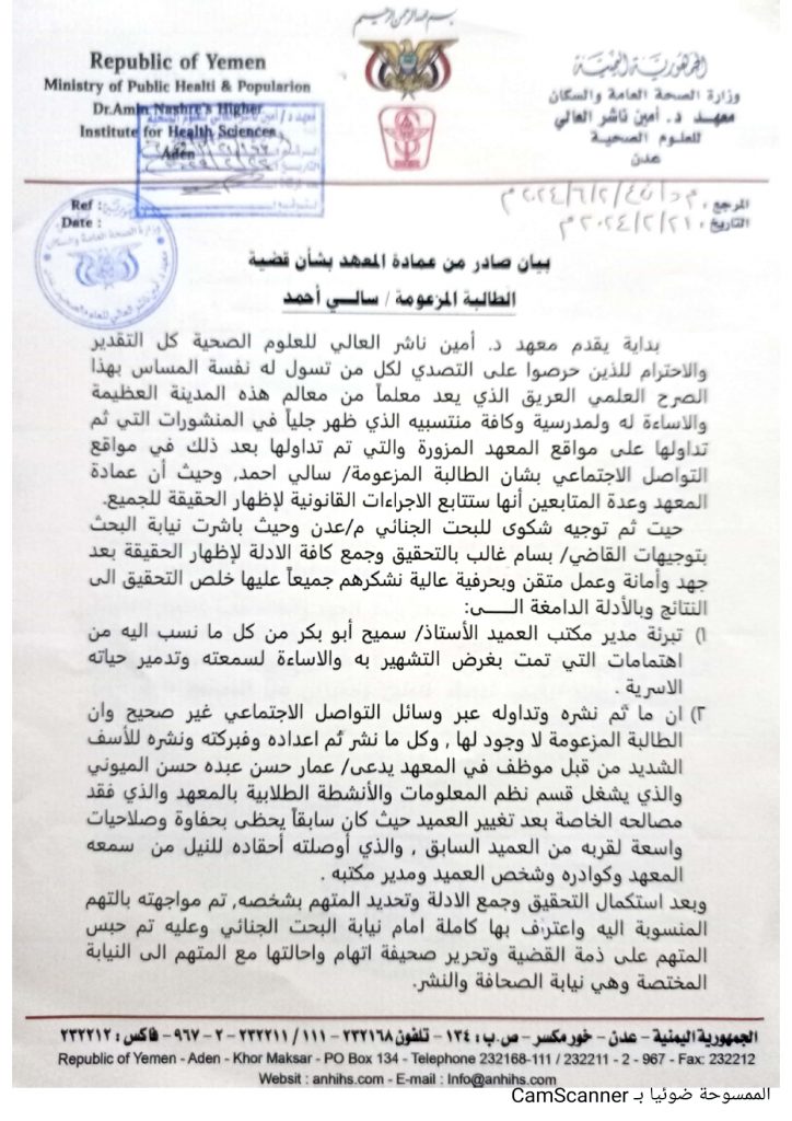 بيان صادر من عمادة المعهد بشأن قضية الطالبة المزعومة سالي أحمد