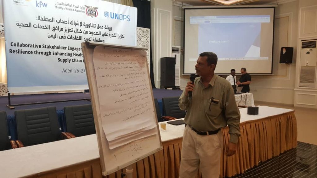 ثم قدمت المحافظات و عدد من المرافق الصحية في العاصمة عدن المشاركة في الورشة أوراق عمل بصورة عروض تقديمية Presentation بأهم الصعوبات و الاحتياجات الضرورية لها التي نفذت خلال المراحل السابقة من كلا من محافظات عدن و أبين ولحج و تعز.