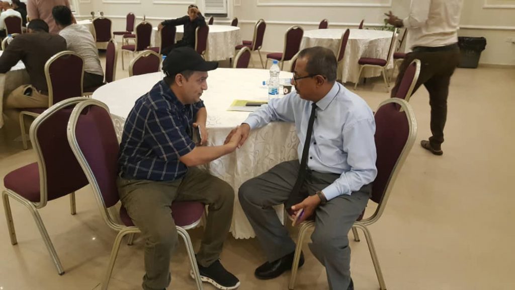 و أقيمت جلسة نقاش لتحديد النقاط الرئيسية و تقسيم المشاركين و المشاركات الى مجموعات و امام المناقشات حول معايير HSSE و التنوع و الدمج الاجتماعي و نظام GRM و نظام الشكاوي من كلا من حسن العطاس و يمنى الاسودي و وفاء باعباد عبر التواصل عبر الانترنت في كلا من عمان/ الأردن و صنعاء و عدن و قامت المجموعات بعرض اعمالها و ممثل كل مجموعه يستعرض نتائج النقاشات.