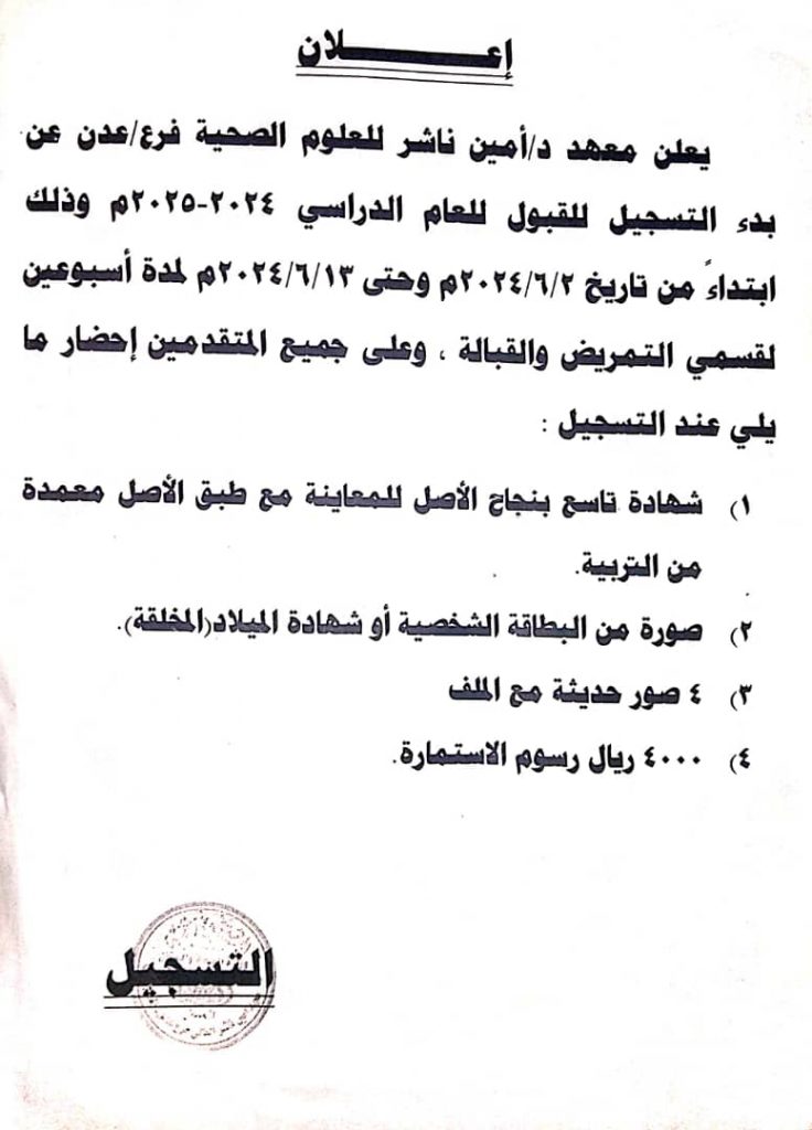 فتح باب التسجيل للقبول في معهد د/ أمين ناشر العالي للعلوم الصحية فرع / عدن الكائن في المعلا 2024-05-28zuhaer ahmad