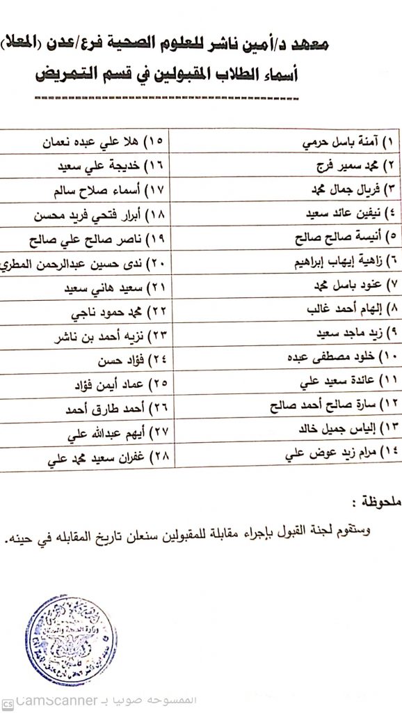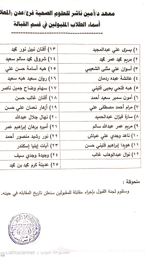 اسماء المقبولين في قسمي التمريض والقبالة للعام الدراسي ٢٠٢٤ / ٢٠٢٥ م في معهد الدكتور امين ناشر العالي للعلوم الصحية فرع عدن الكائن في المعلا