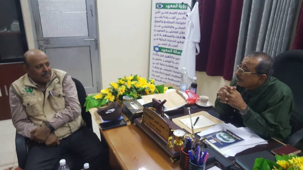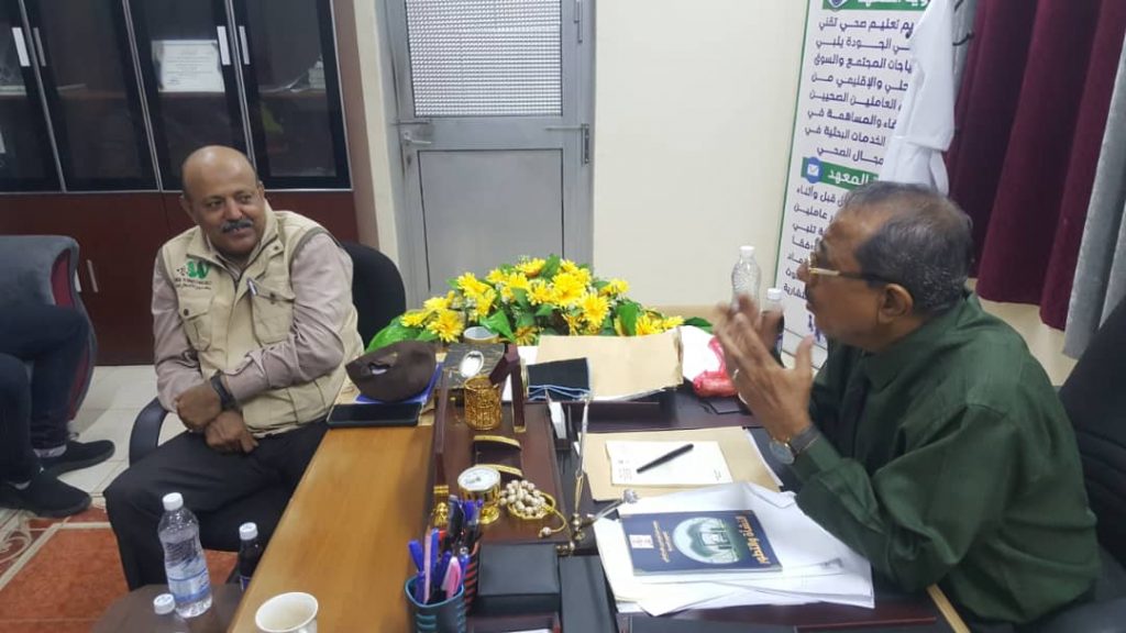 استقبل عميد معهد د. أمين ناشر العالي للعلوم الصحية د. جمال ناصر امذيب اليوم في مكتبه المهندس محسن علوي مدير المنطقة الفرعية مكتب الأشغال العامة عدن / ابين و الفريق المرافق له لنقاش تدخلات المكتب في إعادة تأهيل وتجهيز دورات المياة للمعهد.