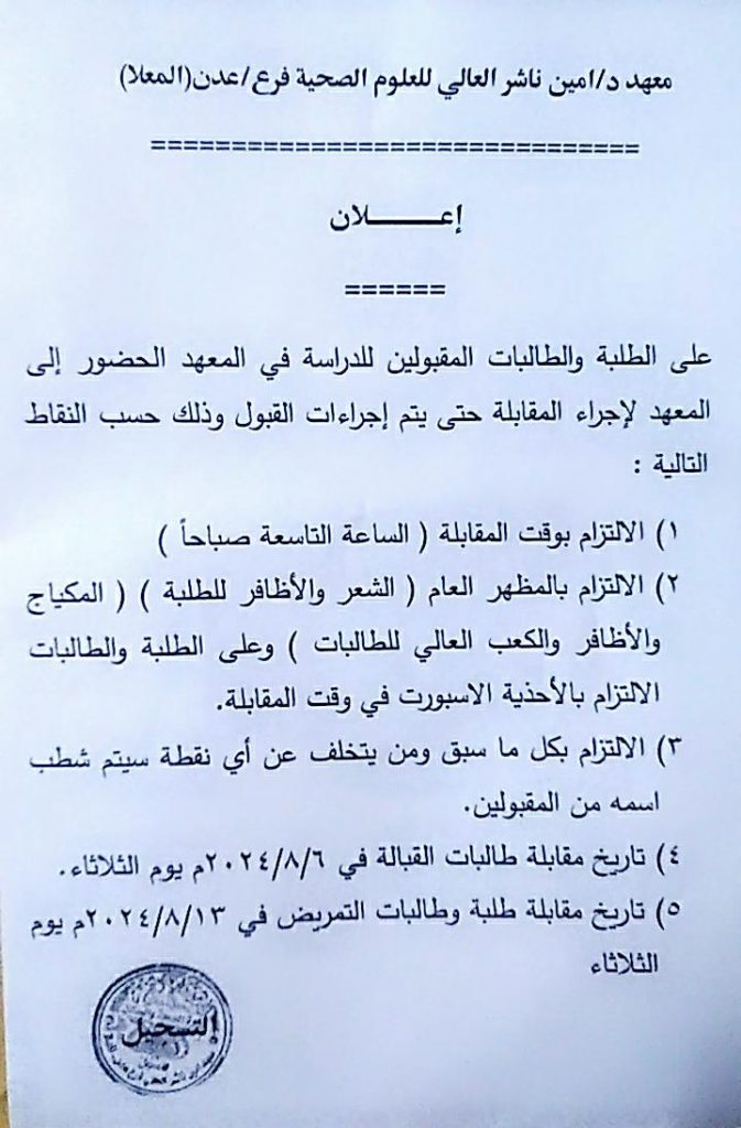 تحديد ايام المقابلة لطلاب و طالبات القبالة و التمريض لمعهد د. امين ناشر العالي للعلوم الصحية فرع عدن الكائن في المعلاتحديد ايام المقابلة لطلاب و طالبات القبالة و التمريض لمعهد د. امين ناشر العالي للعلوم الصحية فرع عدن الكائن في المعلا 2024-07-27zuhaer ahmad