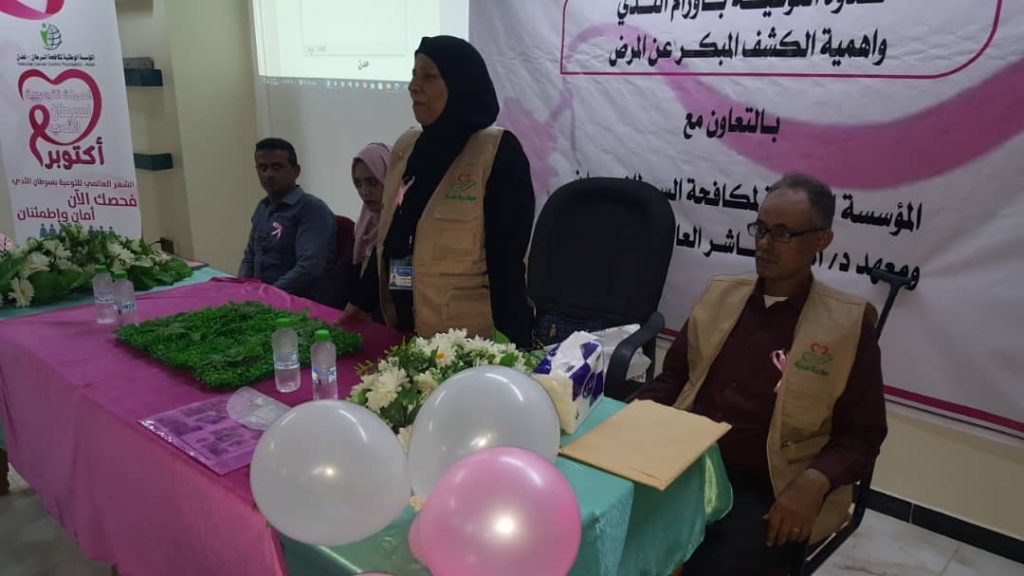 أقيمت امس بمعهد د. أمين ناشر العالي للعلوم الصحية و بالتنسيق مع عمادة المعهد ندوة التوعية بأورام الثدي وأهمية الكشف المبكر عن المرض من قبل مبادرة محبه للاعمال الإنسانية بالتعاون مع المؤسسة الوطنية لمكافحة السرطان / عدن و بحضور من طالبات المعهد تخصص المختبرات و قد لقيت الفعالية تفاعلا كبيرا بالأسئلة و الإجابات حول أورام الثدي و طرق علاجه.