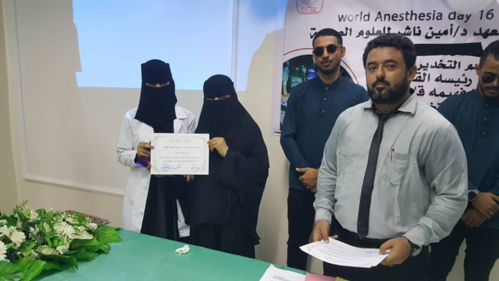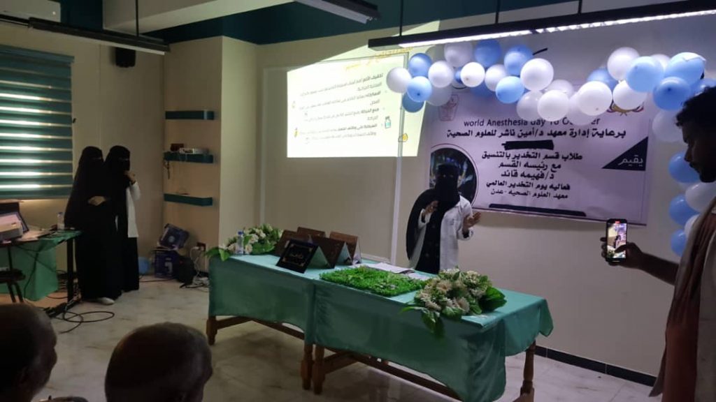 اقيمت اليوم بمعهد د. أمين ناشر العالي للعلوم الصحية و برعاية من عميد المعهد د. جمال ناصر امذيب احتفالية بمناسبة اليوم العالمي للتخدير و بأشراف من الاستاذة / فهيمة قائد رئيسة قسم التخدير و بتنفيذ طلاب و طالبات قسم التخدير بالمعهد حيث بدأت الفعالية بتلاوة من ايات الذكر الحكيم ثم كلمات ترحيبية من قبل طلاب و طالبات القسم بالحضور الكريم ثم قدمت الاستاذه فهيمة قائد نبذة تعيفية باهمية التخدير و نشأته الاولى سارده تطوره التاريخي و امكانياته الاخيرة في عالم الطب و تطبيقات الذكاء الصناعي.