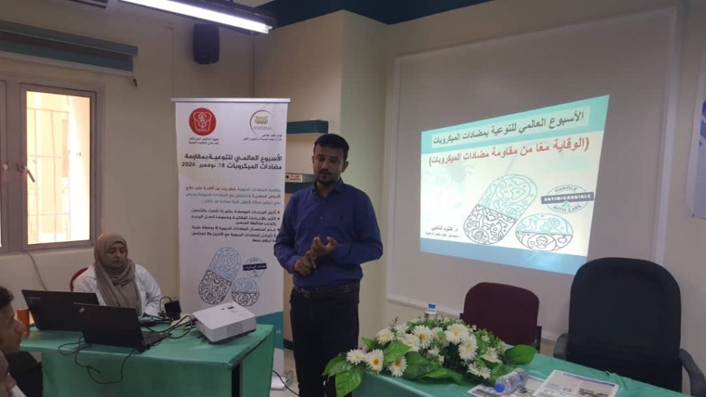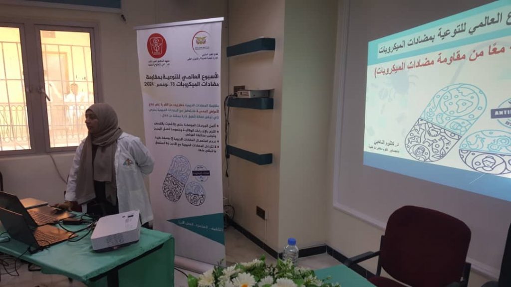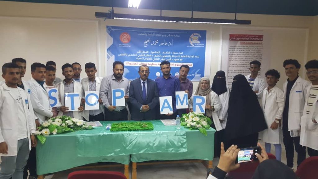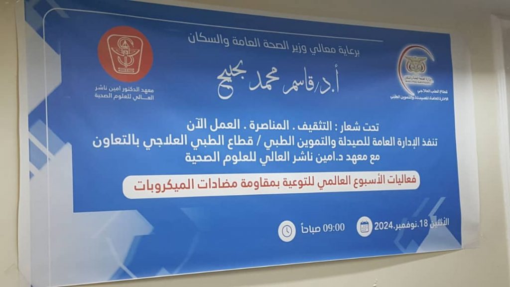 أقيمت في معهد د. أمين ناشر العالي للعلوم الصحية وبرعاية وزير الصحة العامة والسكان د. قاسم محمد بحيبح وبدعم من عمادة المعهد ممثلة بالدكتور/ جمال ناصر امذيب وبتنظيم من دائرة الانشطة الطلابية بالمعهد برئاسة د. رباب هرهره و بتنسيق مع قطاع الطب العلاجي الإدارة العامة للصيدلة و التموين الطبي وتحت شعار ( التثقيف ، المناصرة ، العمل الان ) فعاليات الأسبوع العالمي للتوعية بمقاومة مضادات الميكروبات.