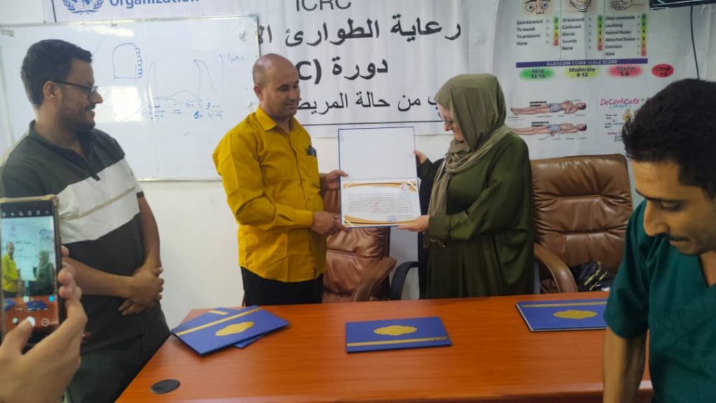 كرم معهد د. امين ناشر العالي للعلوم الصحية فرع الضالع السيدة / شارلوت كريستين بارتميلو مديرة مشروع اللجنة الدولية للصليب الأحمر بمستشفى محمد بن زايد بالضالع لما تقدمه منظمتها من خدمات للتدريب العملي لطلاب وطالبات المعهد الفرعي في المستشفى ، والتي بدورها قدمت شهادات و رسائل الشكر الجزيل لعمادة المعهد برئاسة د. جمال امذيب عميد المعهد و كذا إدارة المعهد الفرعي في الضالع ممثلة بالاخ وائل عبدالله محمد مدير المعهد في الضالع لما يبذلونه في خلق بيئة تعليمية متميزة تحفز الطلاب على التعلم و النمو اكاديميا لتحقيق النجاح و التميز المستمر مع خالص تمنيها بدوام التوفيق في تحقيق الأهداف المستقبلية.