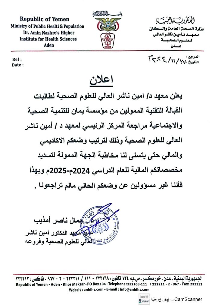 اعلان لطالبات القبالة التقنية الممولين من مؤسسة يمان ضرورة مراجعة المركز الرئيسي للمعهد لترتيب وضعهم الاكاديمي لتسديد مخصصاتهم المالية اعلان لطالبات القبالة التقنية الممولين من مؤسسة يمان ضرورة مراجعة المركز الرئيسي للمعهد لترتيب وضعهم الاكاديمي لتسديد مخصصاتهم المالية 2024-11-27zuhaer ahmad