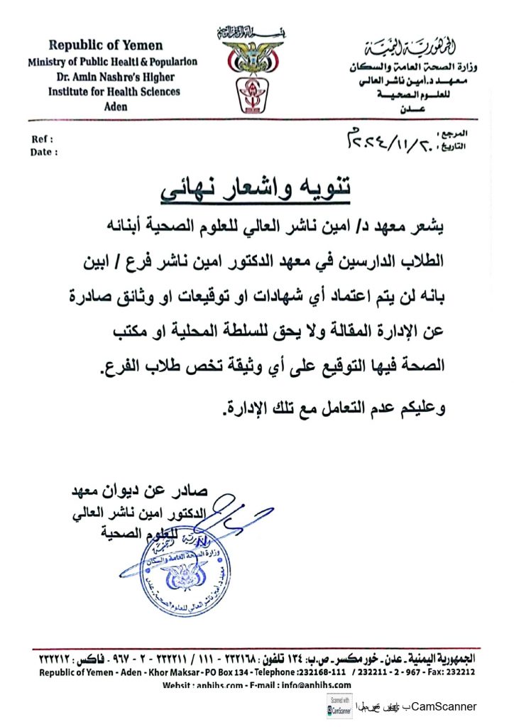 تنوية وإشعار نهائي للطلاب الدارسين في معهد الدكتور امين ناشر للعلوم الصحية فرع أبين بشأن عدم التعامل مع ادارة المعهد المقالة في ابينللطلاب الدارسين في معهد الدكتور امين ناشر للعلوم الصحية فرع أبين بشأن عدم التعامل مع ادارة المعهد المقالة في ابينتنوية وإشعار نهائي للطلاب الدارسين في معهد الدكتور امين ناشر للعلوم الصحية فرع أبين بشأن عدم التعامل مع ادارة المعهد المقالة في ابين 2024-11-27zuhaer ahmad
