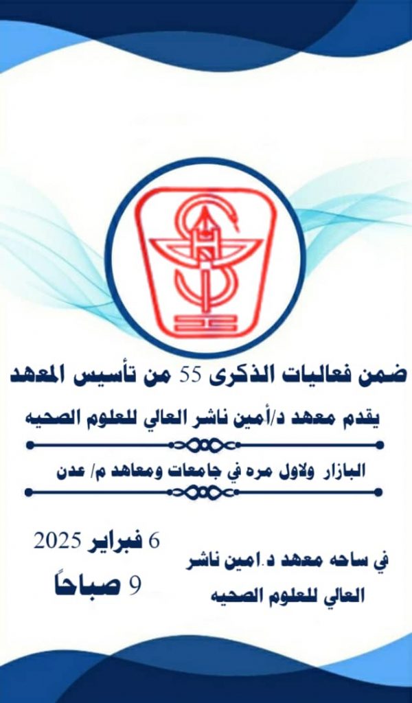 يسر معهد د/أمين ناشر العالي للعلوم الصحية دعوتكم لحضور,,, البازار الأول، الذي سيُقام ضمن فعاليات الذكرى الـ55 لتأسيس المعهد، وذلك يوم الخميس، 6 فبراير 2025، من الساعة التاسعة والنصف صباحًا، في ساحة المعهد – خور مكسر، بعد جولة البط.