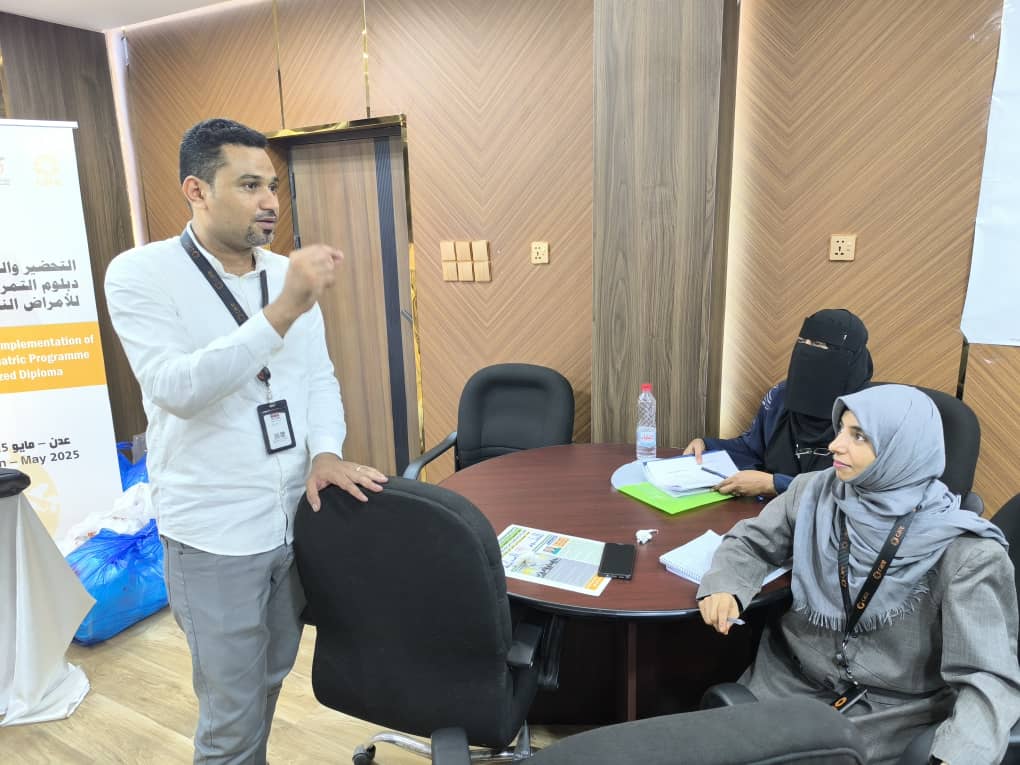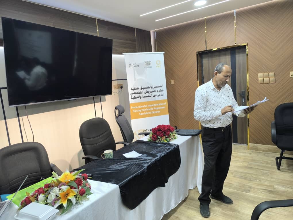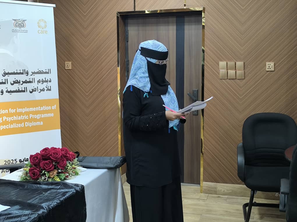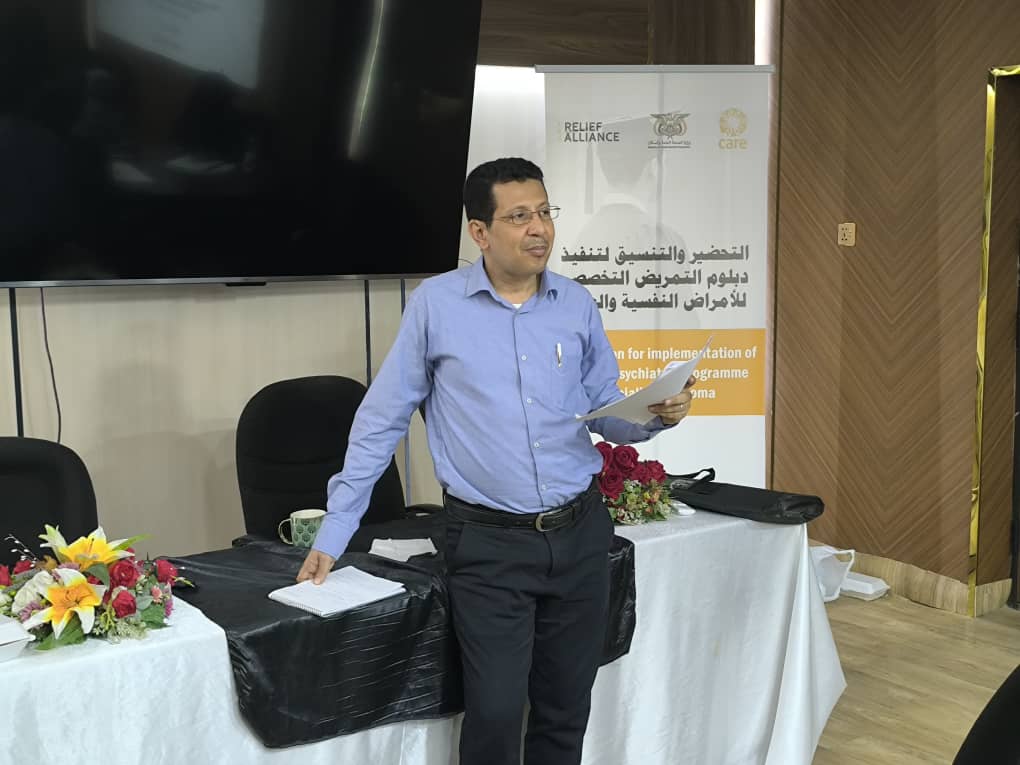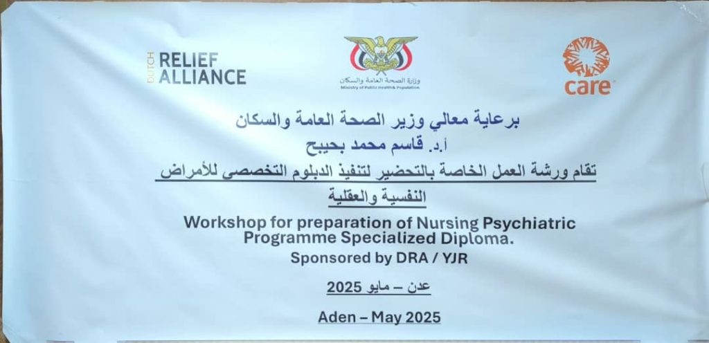 في الورشة التي يديرها د. خالد عبدالله زين السقاف عرف عنوان الورشة و من خلال مقدمة لمشروع دعم الصحة النفسية والعقلية في المستشفيات التخصصية كمرحلة أولى والتي تساهم منظمة كير في تمويل و تحديث منهج الدبلوم التخصصي لمدة سنه في مجال مخرجات التمريض العالي بعد الثانوية العامة من المعاهد الصحية المعتمدة وضمن مشروع تأهيل مجموعة من الطلاب للذين يعملون في المستشفيات التخصصية بالأمراض النفسية في عدن وتعز بدرجة أساسية و التي تنطبق عليهم شروط القبول وسيقوم بالتحديث مجموعه من المتخصصين في المجال الاكاديمي والعلمي بالإضافة الى اثراء النقاش من المشاركين من عدة اطراف ذات العلاقة بالصحة النفسية و العقلية.