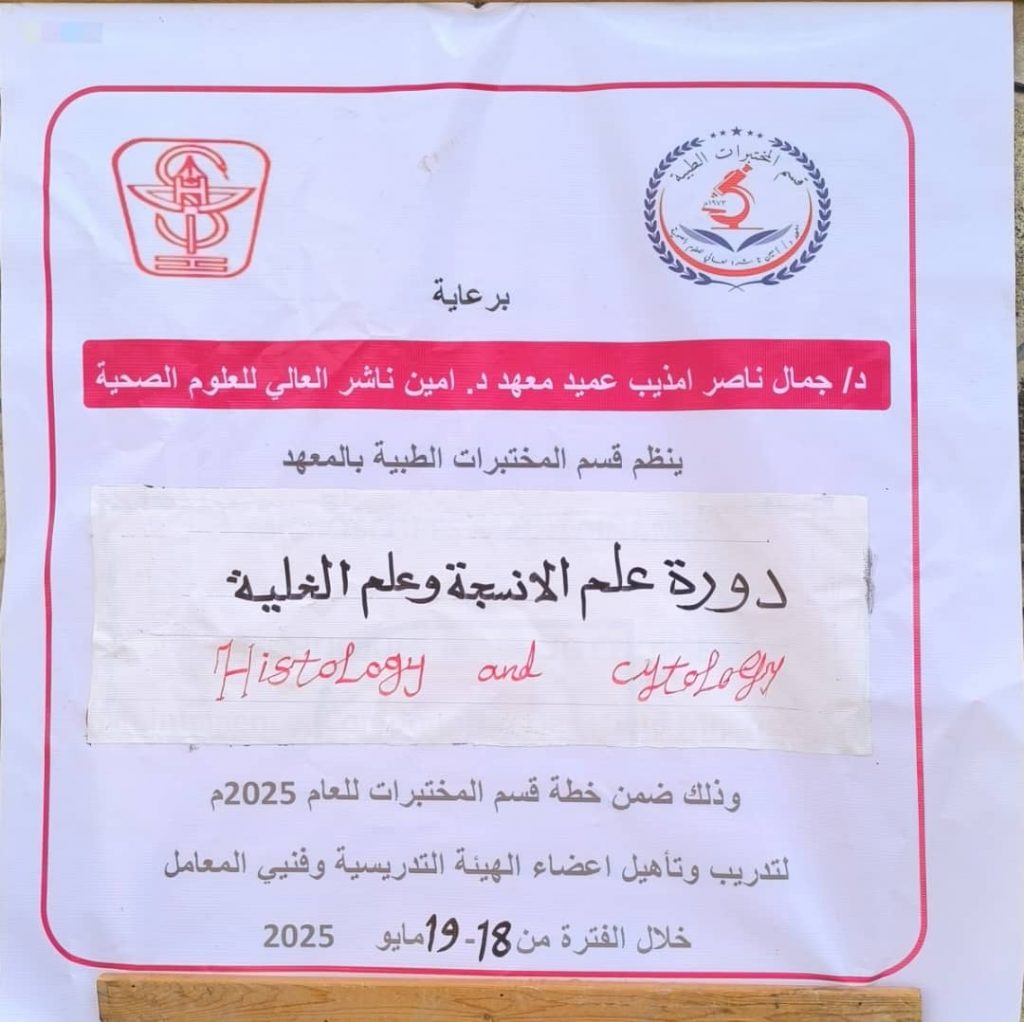 أقيمت خلال الفترة من 18 – 19 / 5 / 2025 م في معهد د. أمين ناشر العالي للعلوم الصحية دورة مكثفة في علم الانسجة وعلم الخلية بدعم كامل وحضور شخصي من عميد المعهد د. جمال ناصر امذيب وبتنسيق علمي من د. وضاح محمد هادي القشبري رئيس قسم المختبرات الطبية بالمعهد بالتنسيق مع نائب العميد للشئون الاكاديمية الأستاذ/ عصام عثمان ونائب العميد لشئون الطلاب والفروع الأستاذ/ أحمد المحضار ودائرة الأنشطة الطلابية ومديرتها د. رباب هرهره.