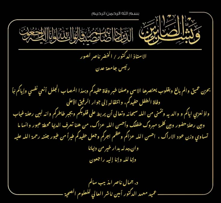 واذ نعزي اياكم و والديه ونتمنى من الله سبحانه وتعالى أن يربط على قلوبكم ويجبر خاطركم وانه لبين رحلة غياب وبين رحلة حضور وبين كلمة مبروك طفلك وأحسن الله عزاك، من هنا تعرف الدنيا محطة عبور وانها ما تساوي وزن عود الاراك ، احسن الله عزاكم وعظم اجركم وجعل حفيدكم طيراً من طيور جنته رحمة الله عليه وان يبدله بدار خير من دنيانا