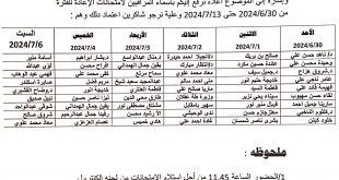 جدول المراقبة لامتحانات الاعادة ٢٠٢٣ – ٢٠٢٤ م