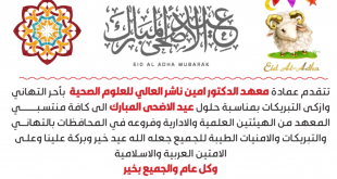 يطيب لعمادة معهد د.أمين ناشر العالي للعلوم الصحية و فروعه في المحافظات ممثلة بعميدها د. جمال ناصر امذيب ان يتقدموا بأخلص التهاني و التبريكات بحلول عيد الاضحى المبارك للأمتين العربية و الاسلاميه و لكافة اعضاء التدريس و الموظفين و لجميع طلاب و طالبات المعهد و لكافة أبناء الشعب العظيم سائلين رب …