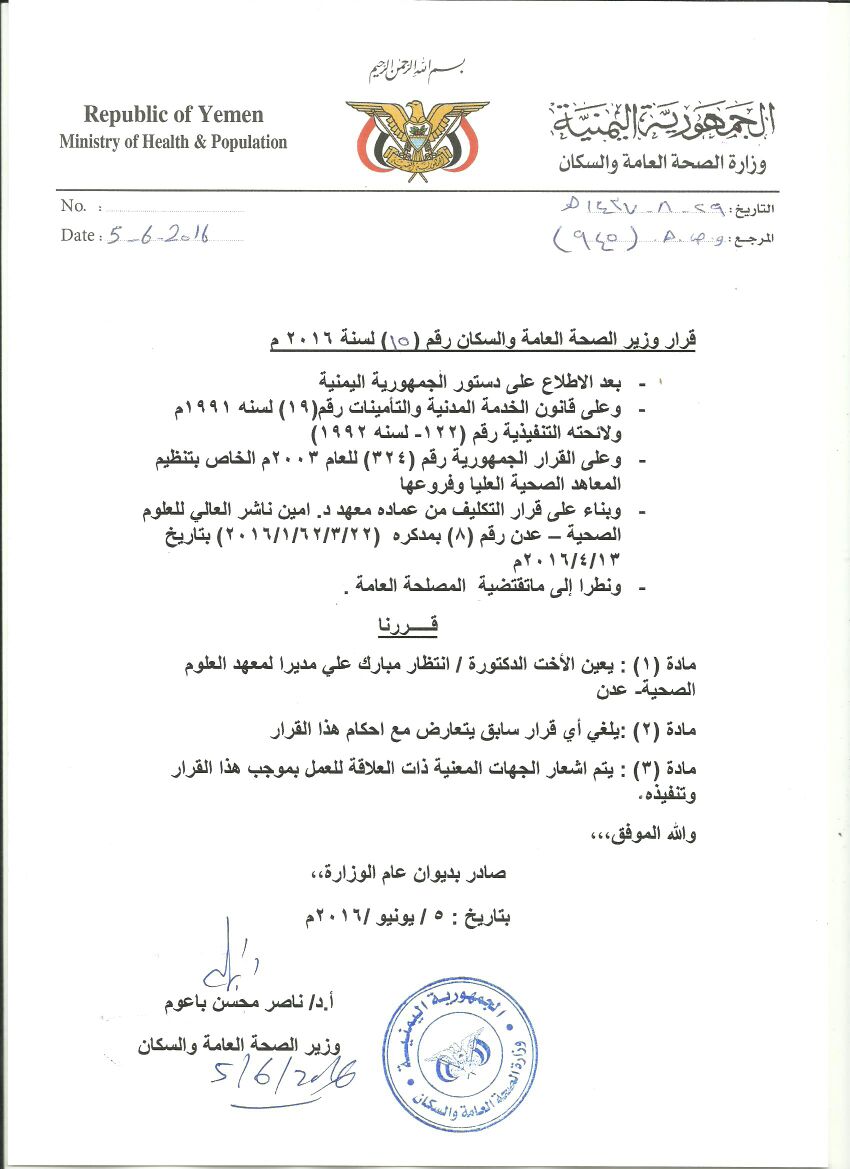 اصدر وزير الصحه و السكان أ.د ناصر محسن باعوم قراراً بتعيين الاخت إنتظار مبارك علي مديراً لمعهد العلوم الصحية / عدن و ذلك بتاريخ 5/يونية/2016 م بناءا على تكليف من عمادة معهد د. أمين ناشر للعلوم الصحية رقم 8 بتاريخ 13/4/2016