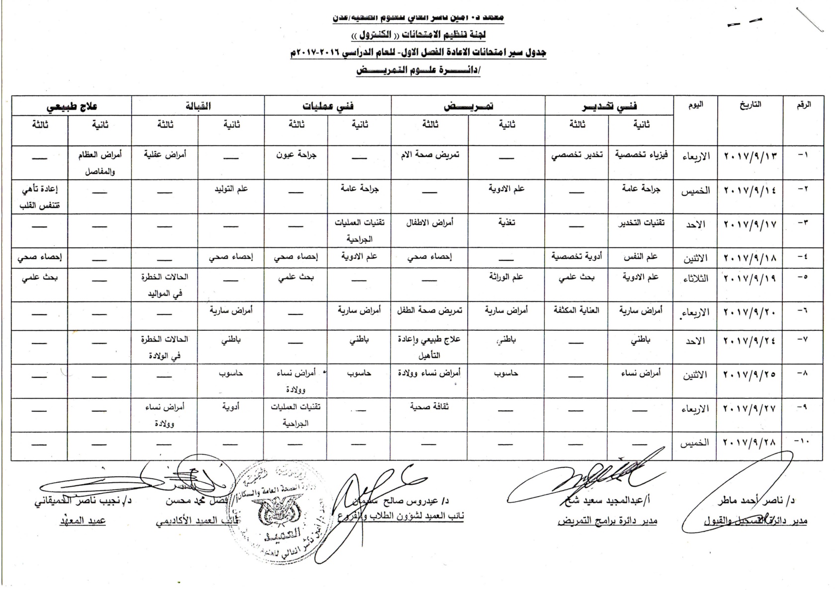 جدول سير امتحانات الاعادة للفصل الاول للعام الدراسي 2016 /2017 مدائرة علوم التمريضاضغط هنا لتحميلة بصيغة PDF=====================دائرة التقنيات الطبيةاضغط هنا لتحميلة بصيغة PDF=========================دائرة صحة المجتمعاضغط هنا لتحميلة بصيغة PDF 2017-08-24zuhaer ahmad