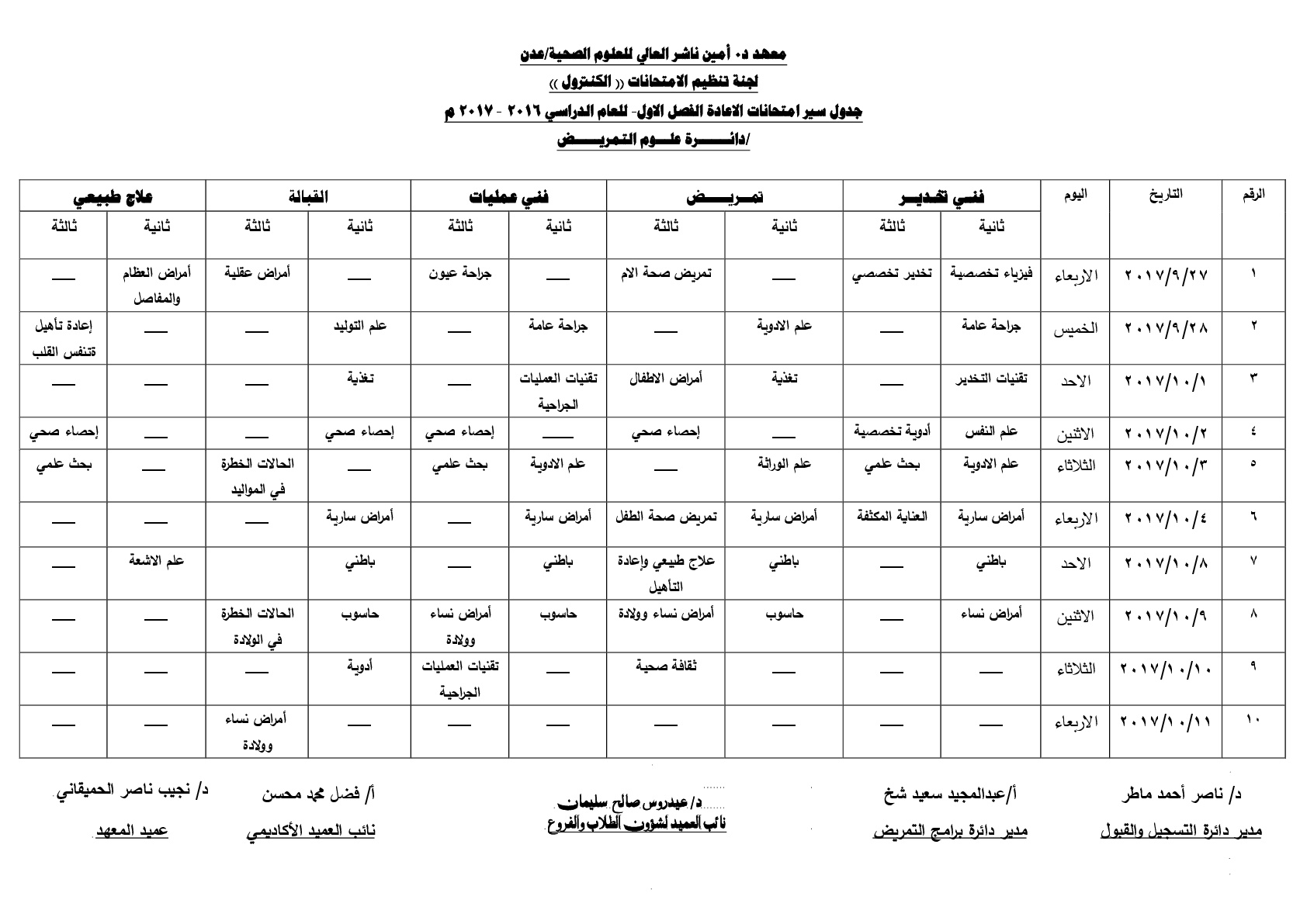 تعديل : جدول سير امتحانات الاعادة للفصل الاول للعام الدراسي 2016 /2017 مدائرة علوم التمريض اضغط هنا لتحميلة بصيغة PDF=====================دائرة التقنيات الطبيةاضغط هنا لتحميلة بصيغة PDF=========================دائرة صحة المجتمعاضغط هنا لتحميلة بصيغة PDF 2017-09-19zuhaer ahmad